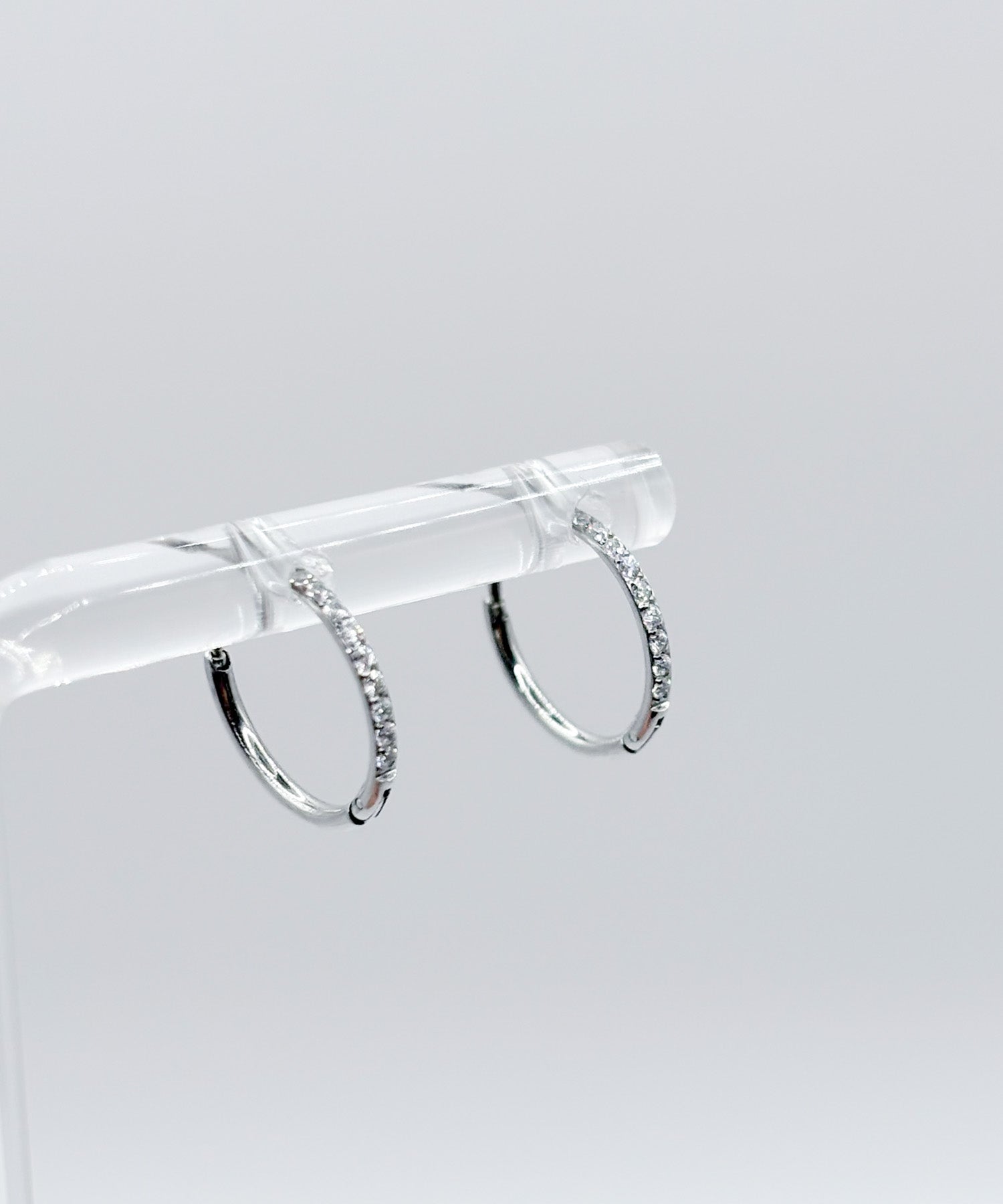 直径約12mmのコンパクトなフープに、ストーンを並べた上品なピアス。シンプルながらもさりげない輝きが耳元にアクセントを添え、オン・オフ問わず幅広いシーンでお使いいただけます。
