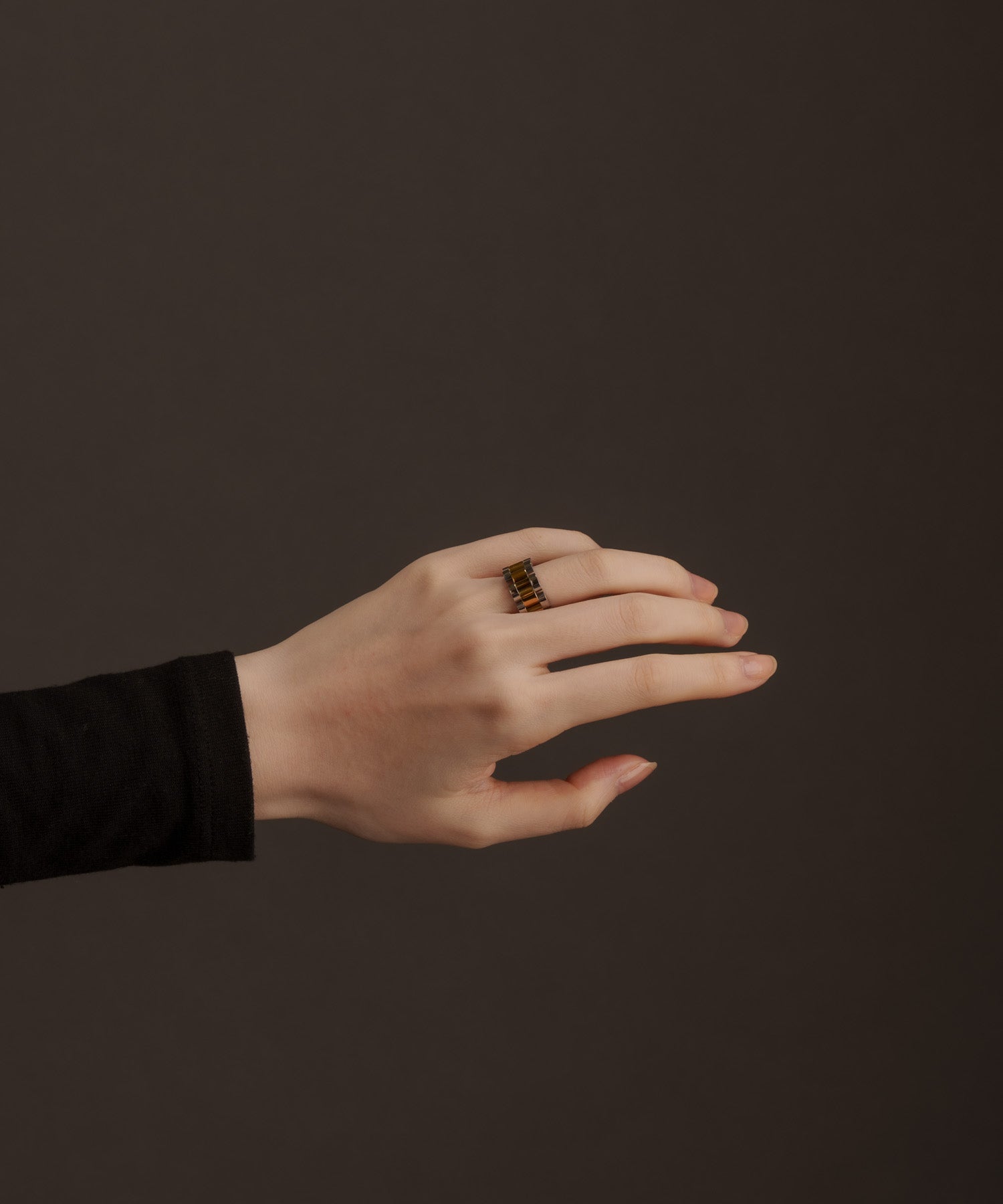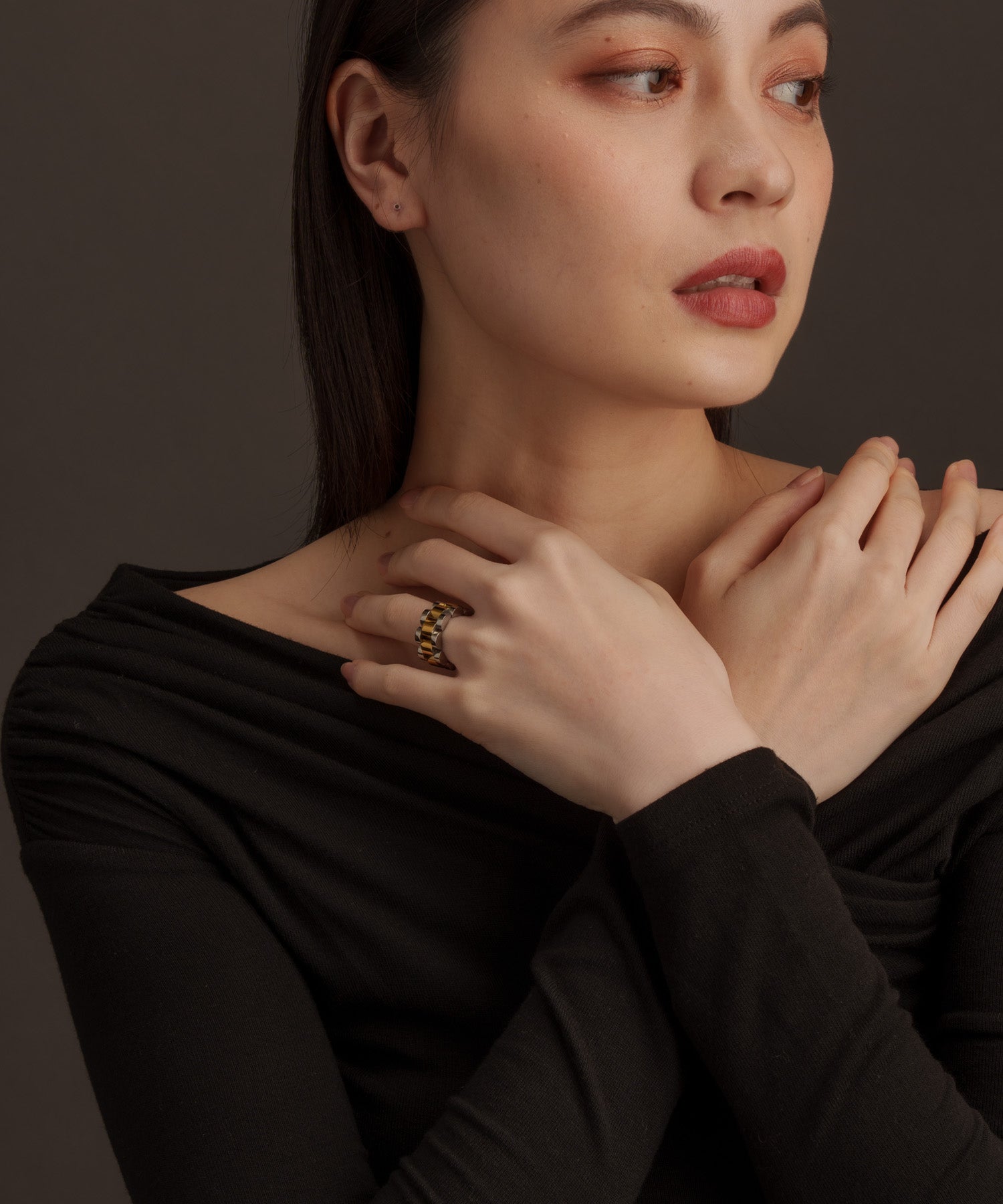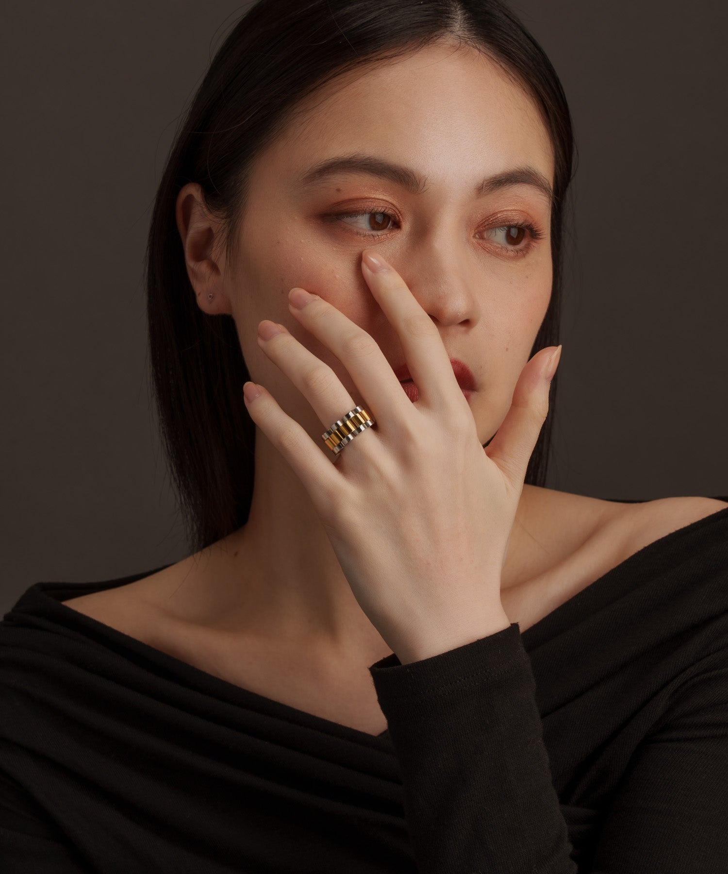 まるで腕時計のベルトを用いたような特徴的なリング。厚みはあるもののどこか上品さも感じるデザインです。