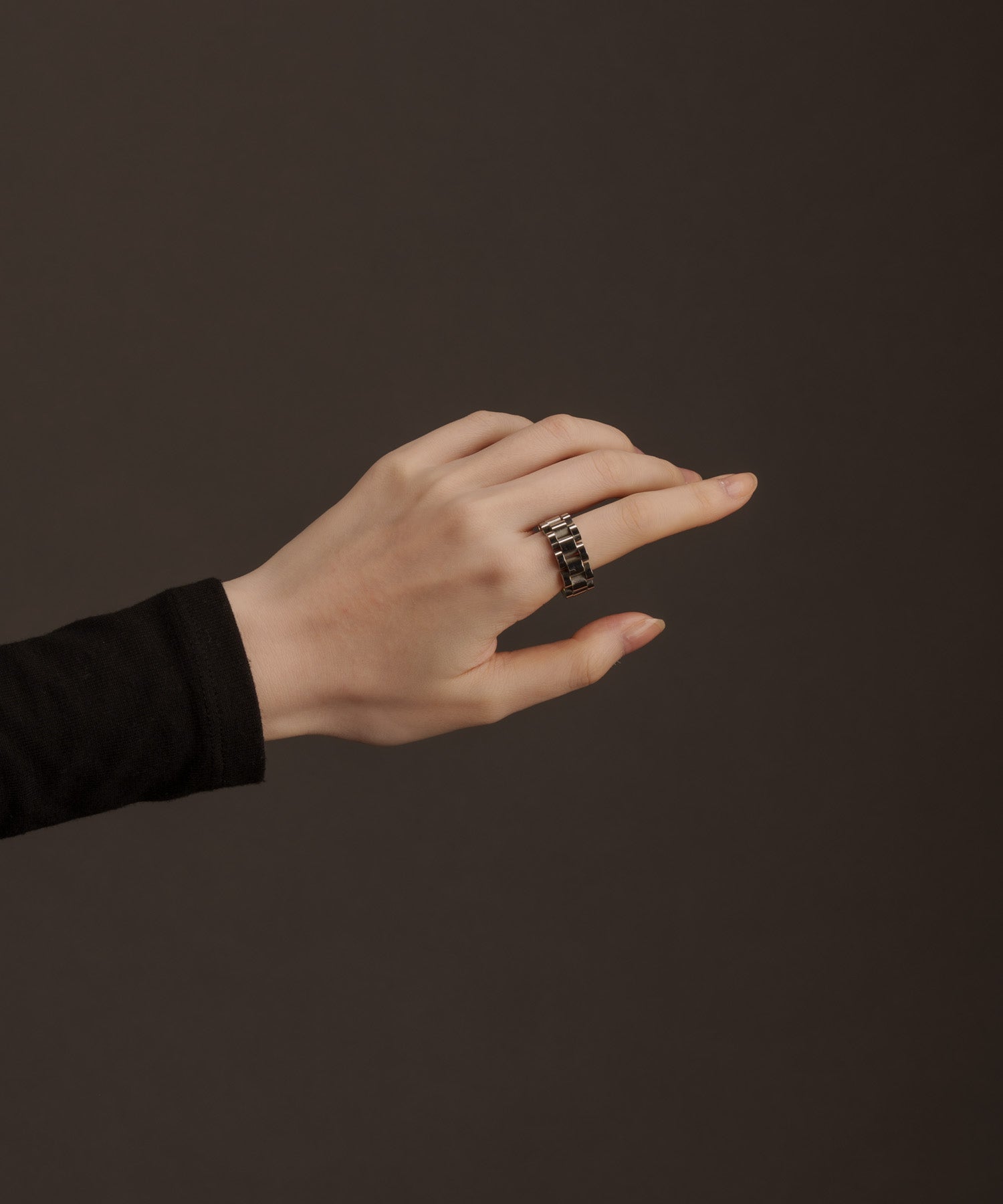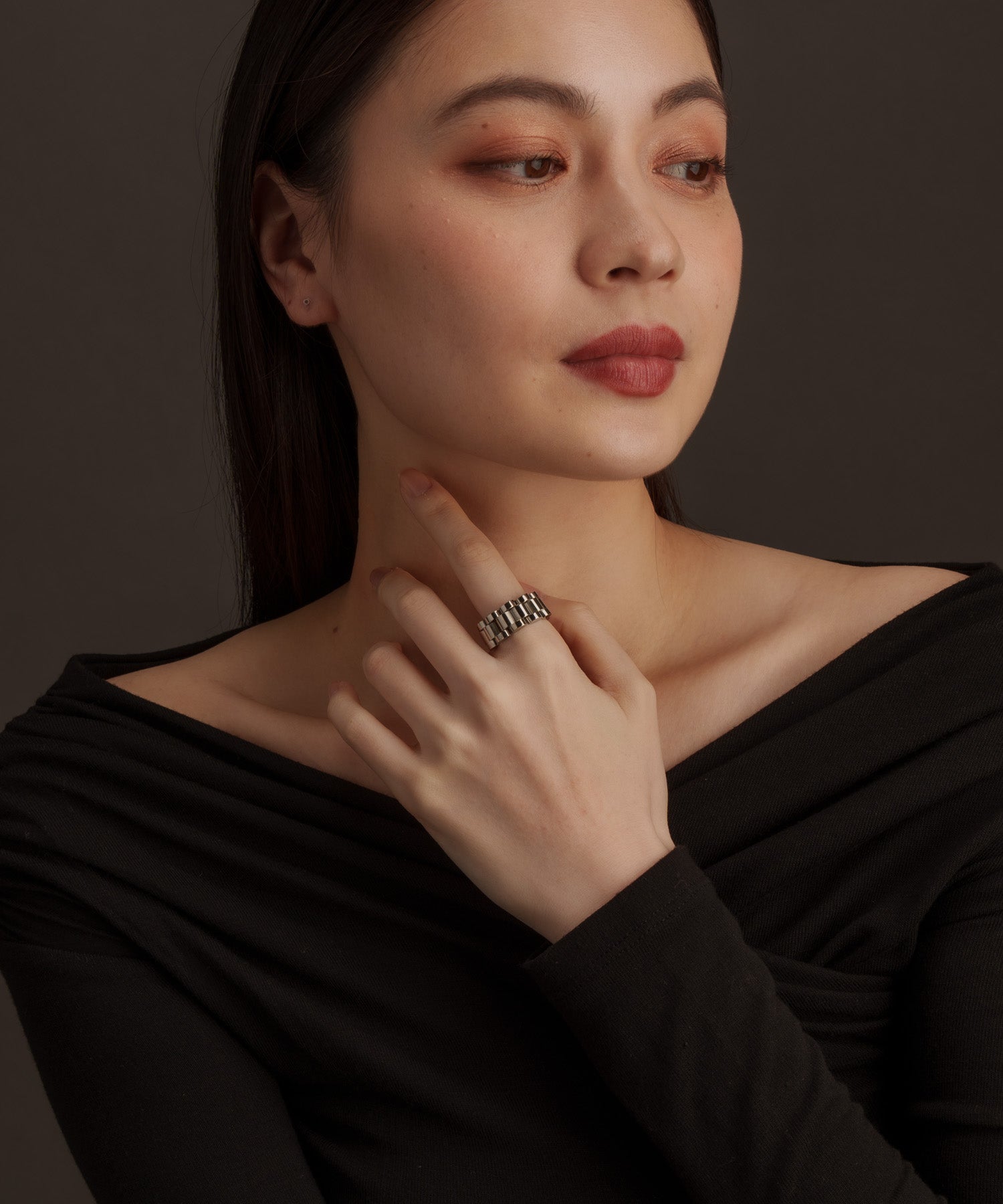 まるで腕時計のベルトを使ったような特徴的なリング。