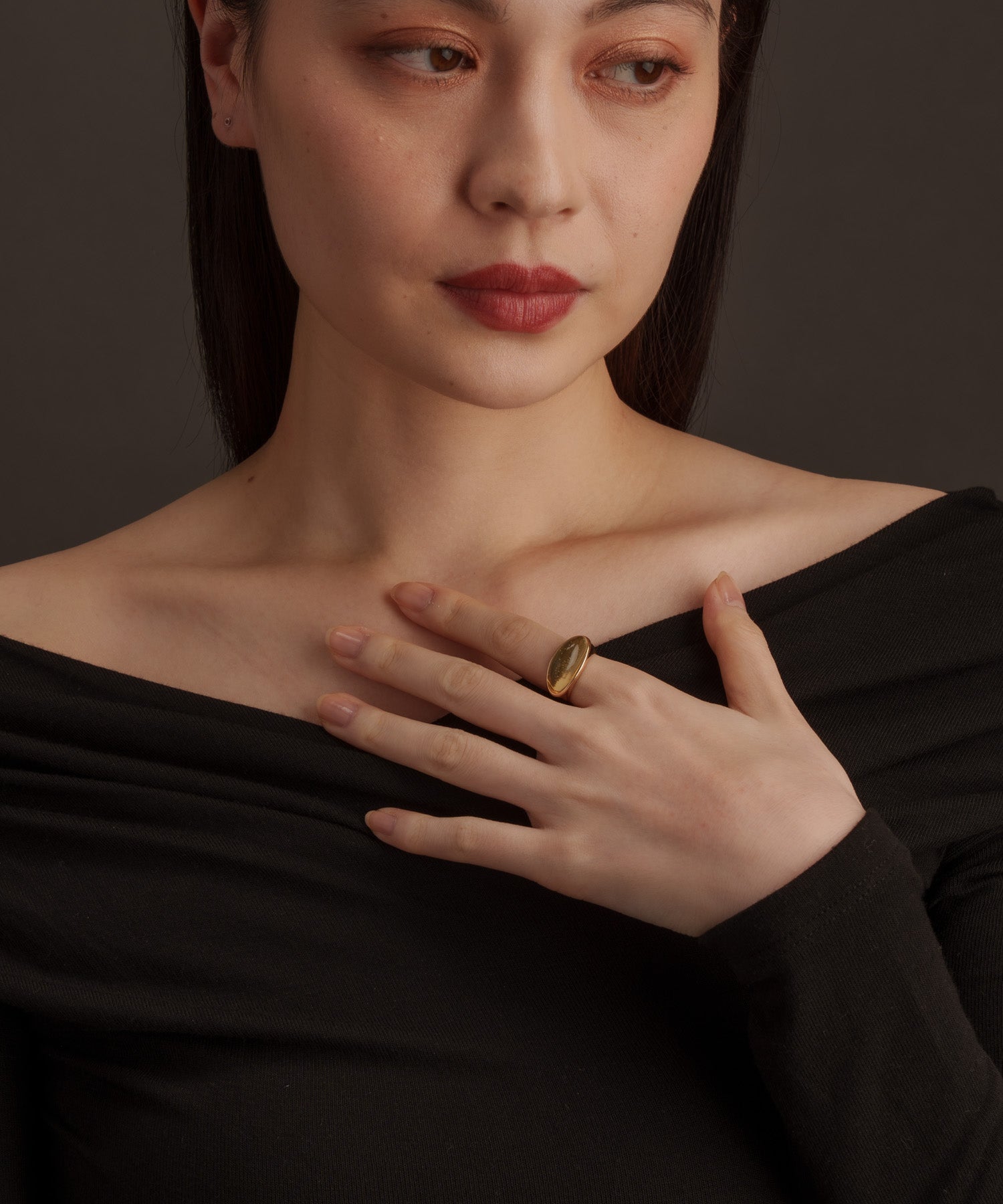 半ドーム型の立体樹脂がキラッと輝くリング。裏側は細めの0.2cm幅で負担なくお付けいただけます。