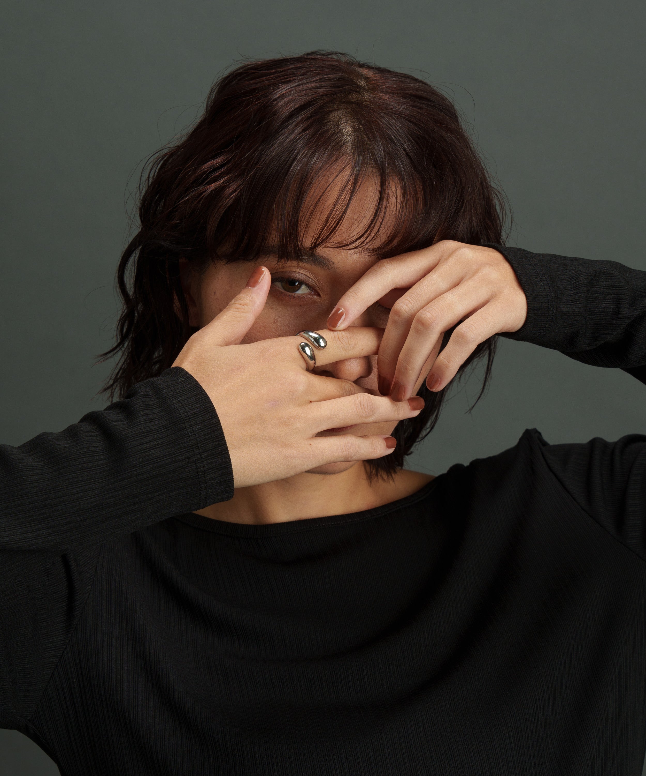 指を抱きかかえるように巻き付いた特徴的なデザインリング。アートのようなカーブが、指先に印象的な存在感を与えます。