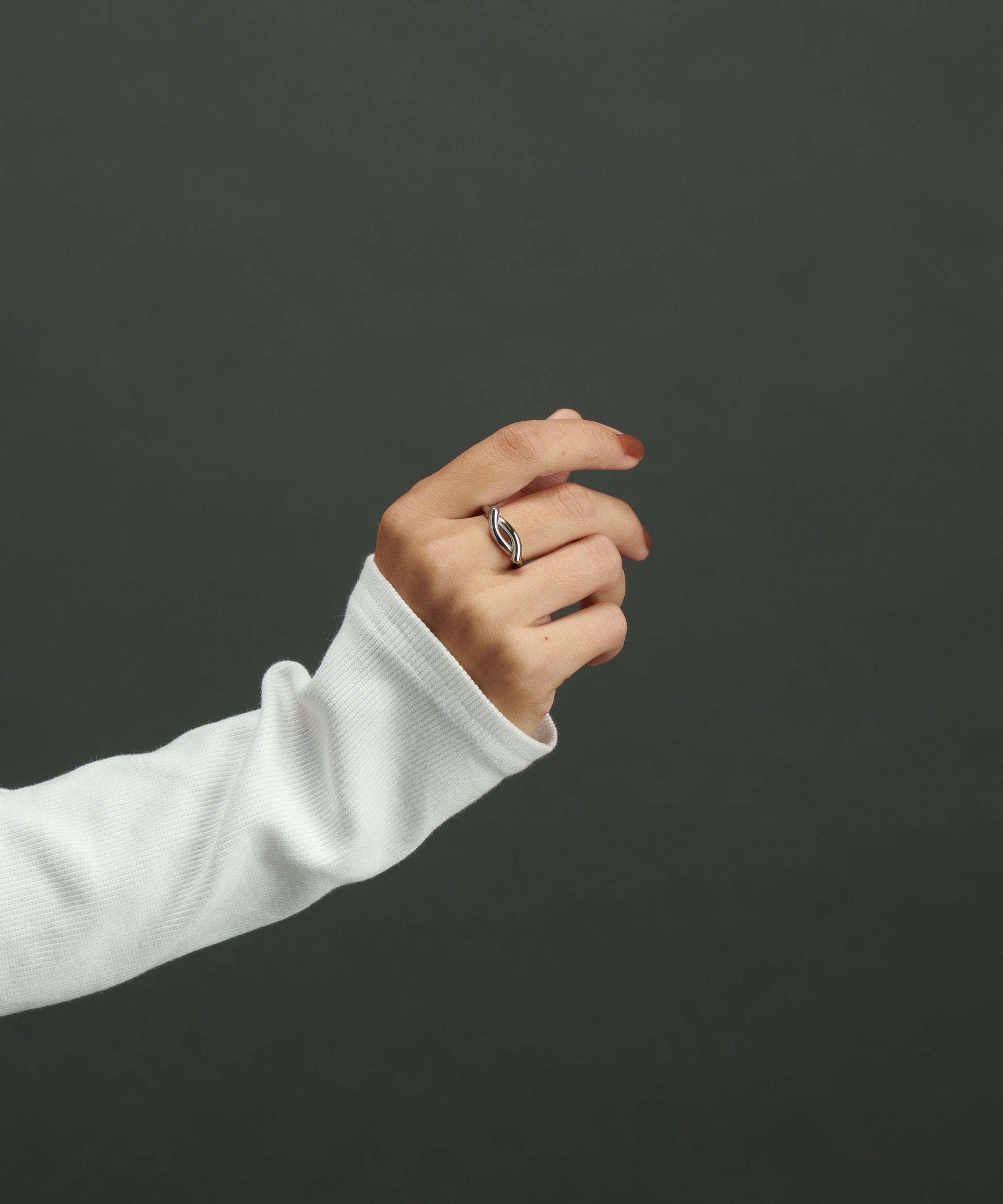 センターにひねりを加えたデザインが、ハンドメイドのような温かみを感じさせるリング。手元に立体感と動きを。