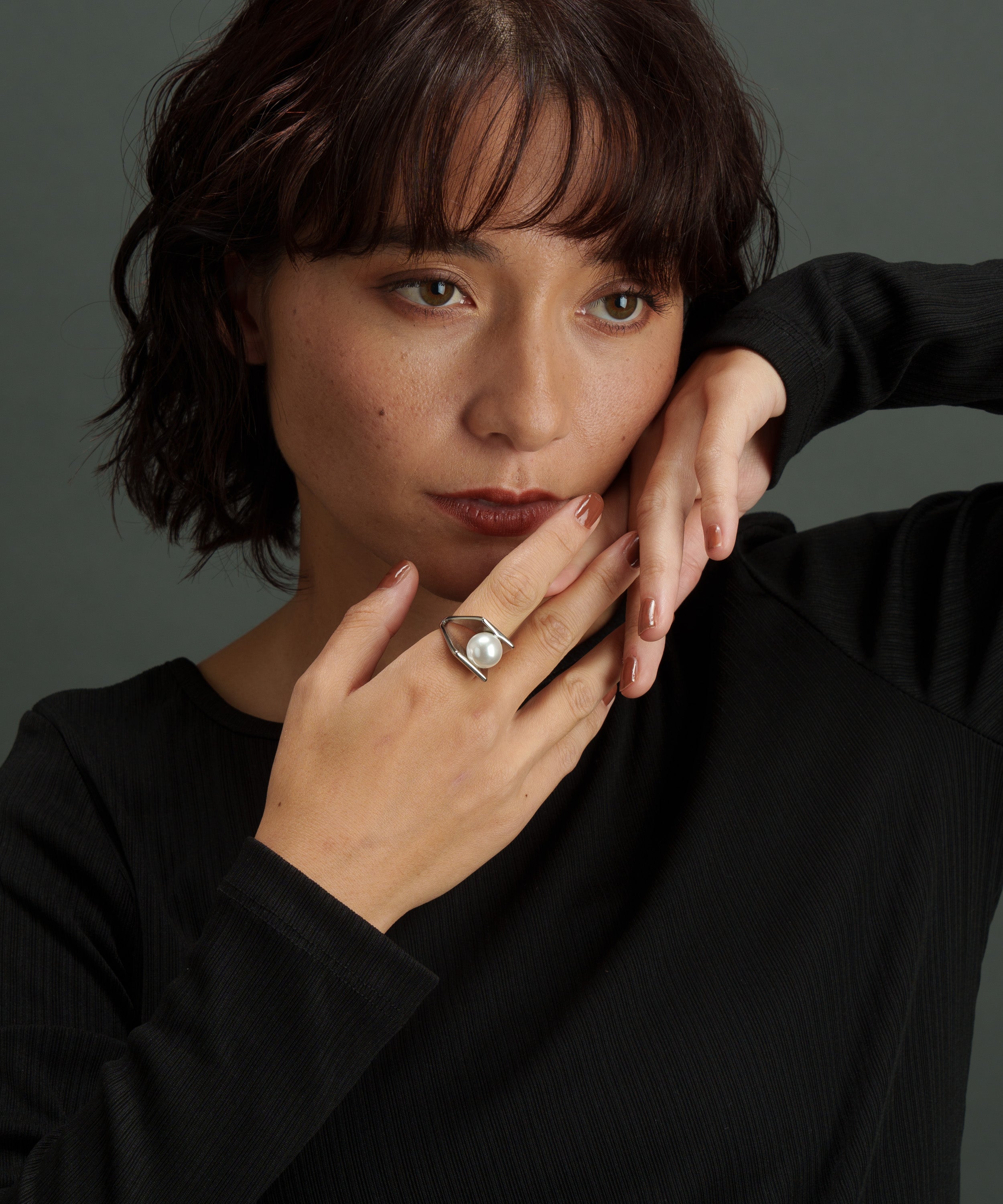存在感のあるフォルムに一粒のパールをサンドしたモダンなリング。直線と曲線のバランスが美しく、指の可動域を妨げない設計で着け心地も抜群です。
