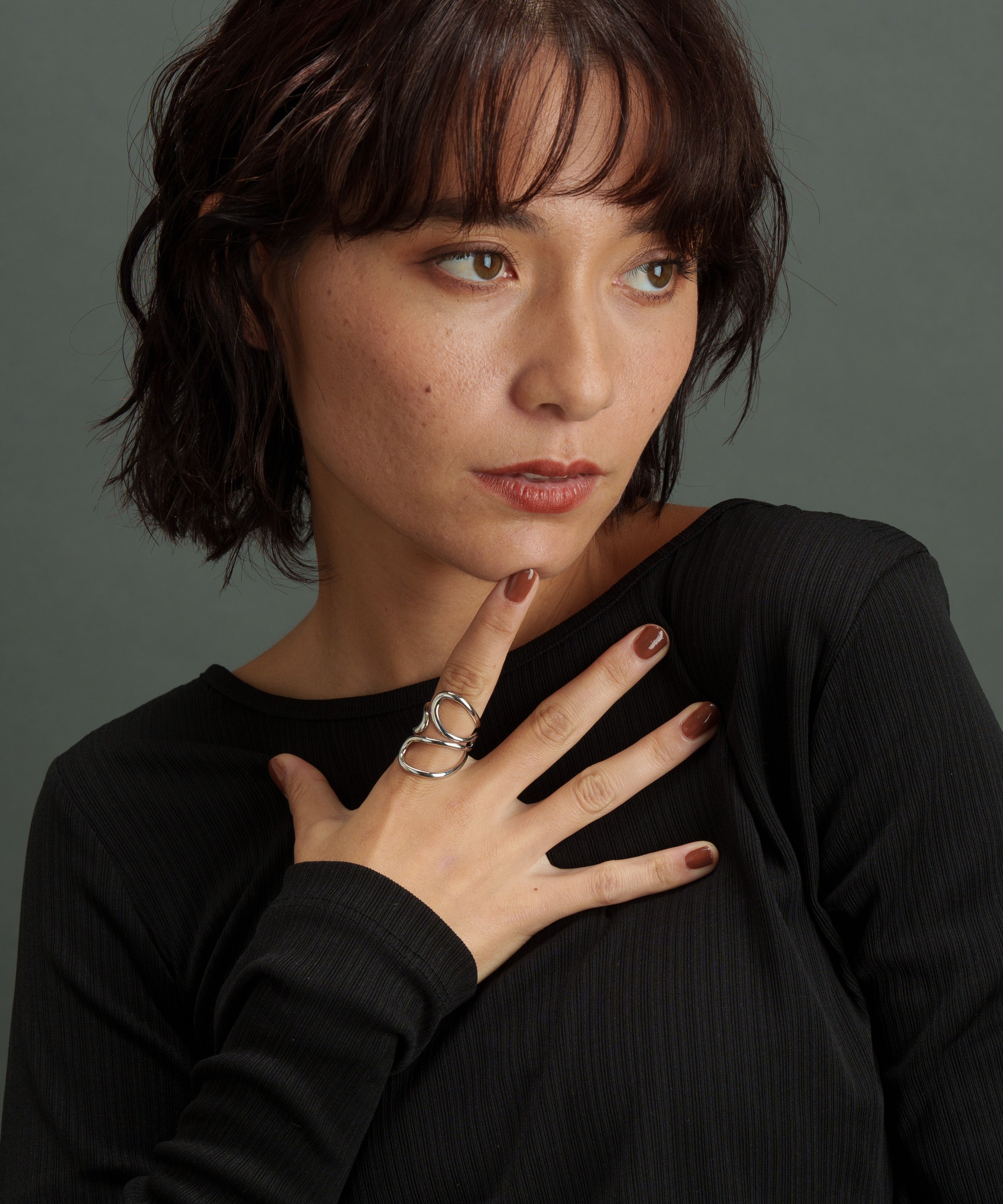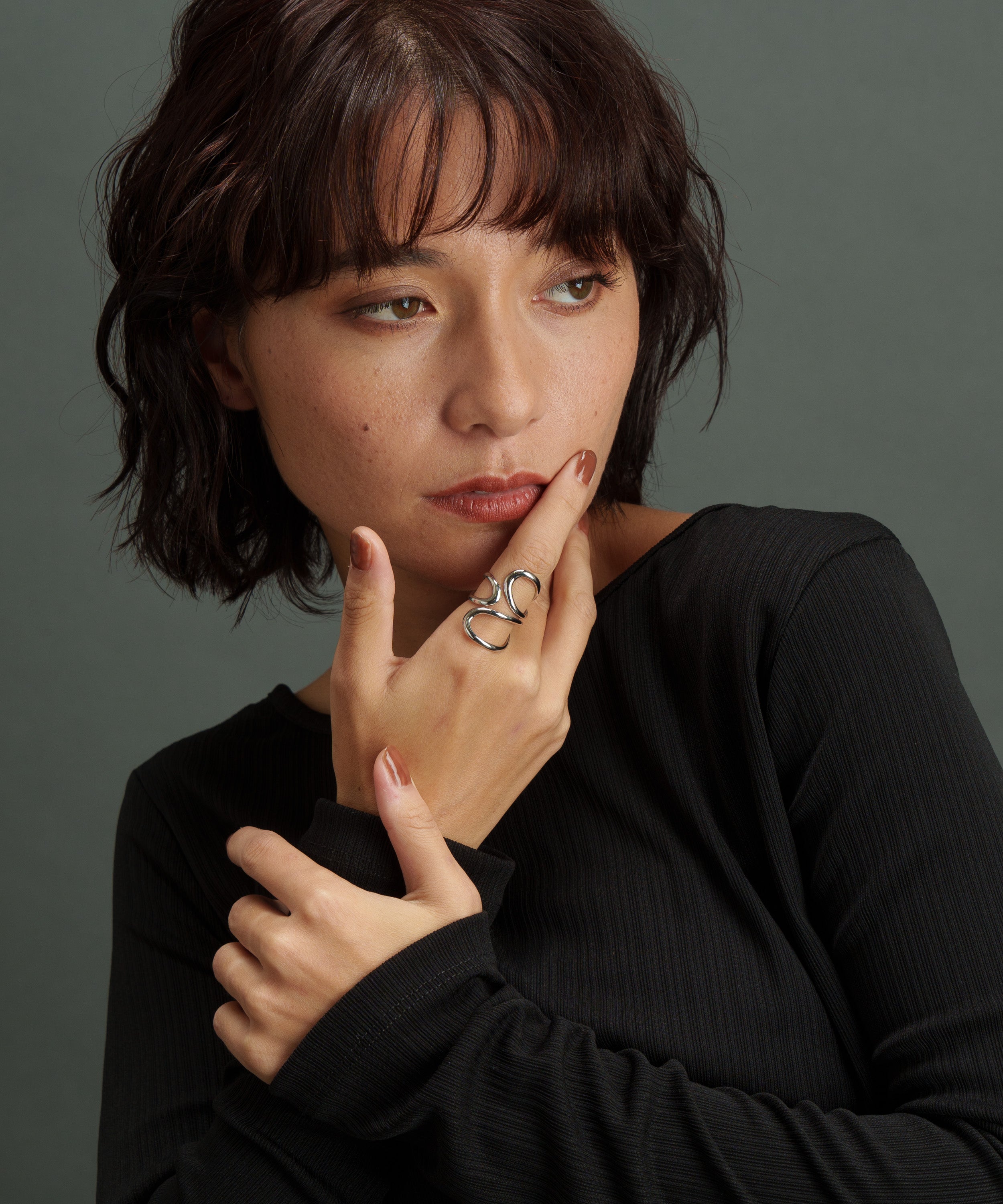 3つのカーブがやさしく指を包み込むアーティスティックなリング。関節までのやや長めの幅でトレンド感のあるモードな手元に。