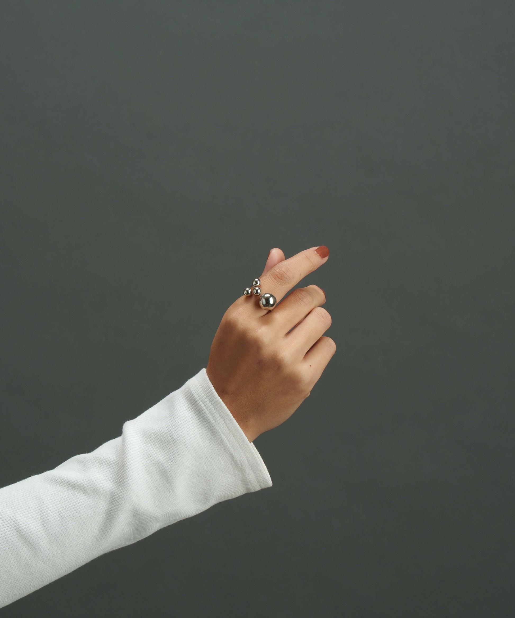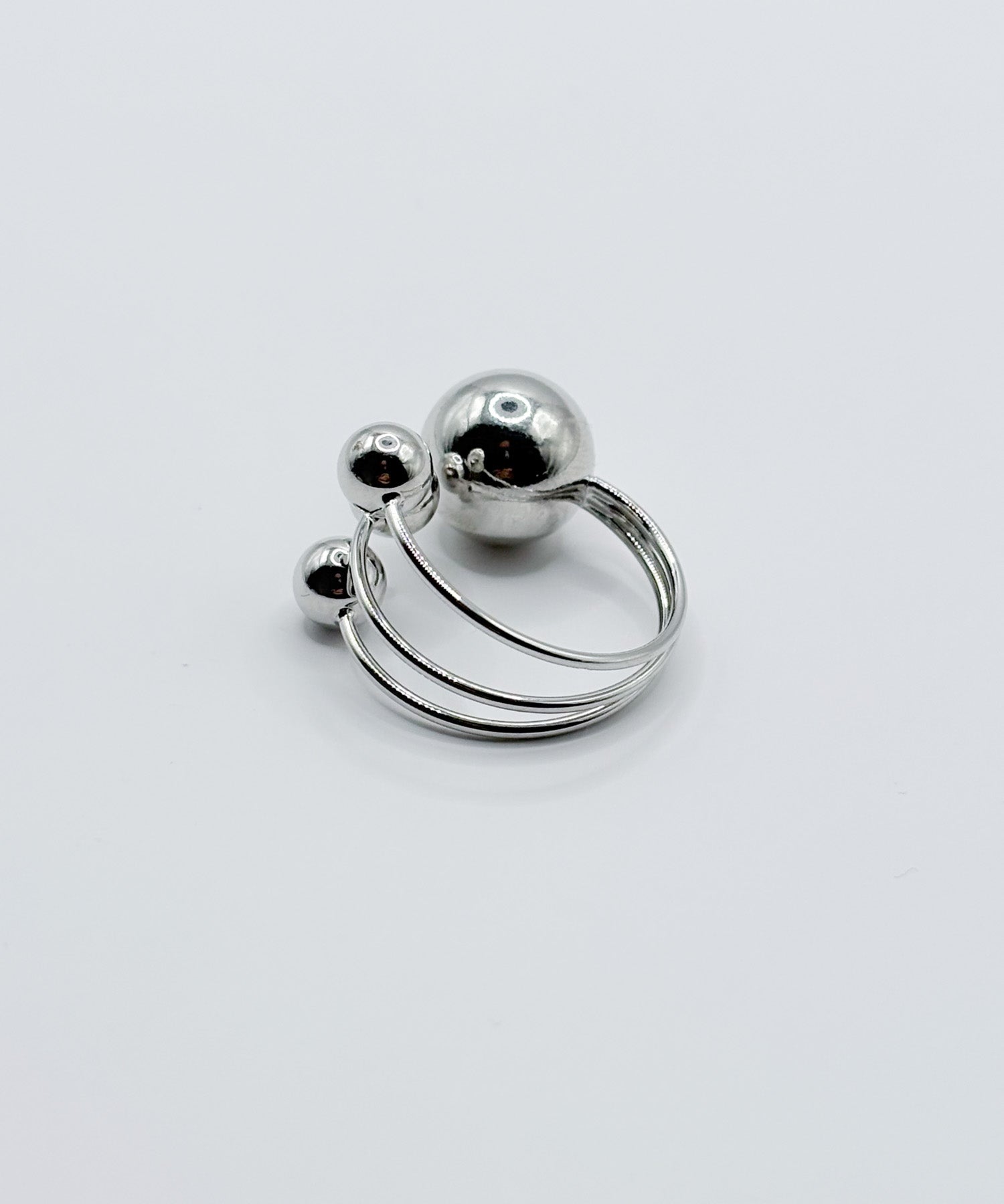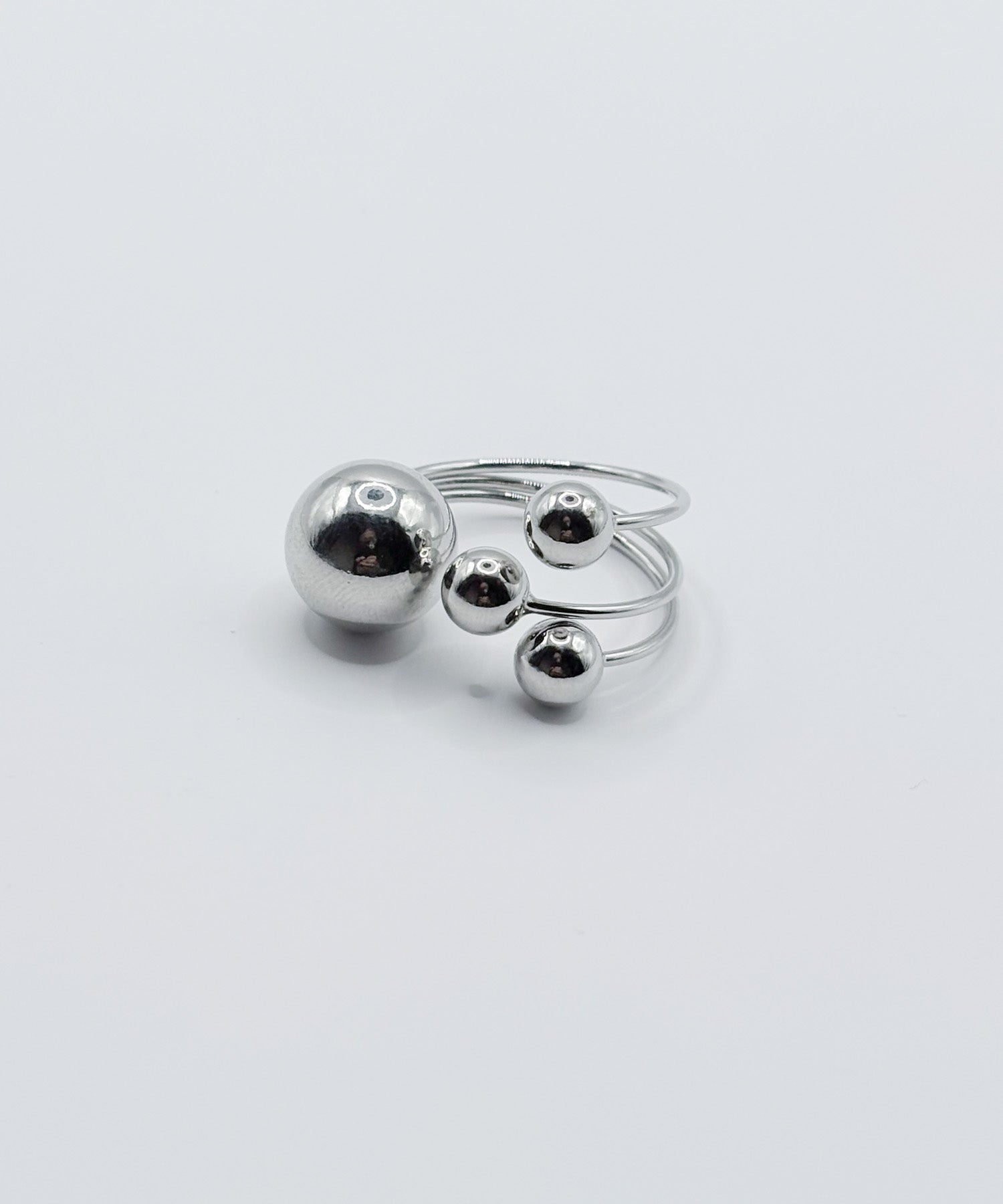 異なるサイズのボールを4つ先端に取り付けた構築的なデザイン。ミニマルでモードな手元をつくるリングです。