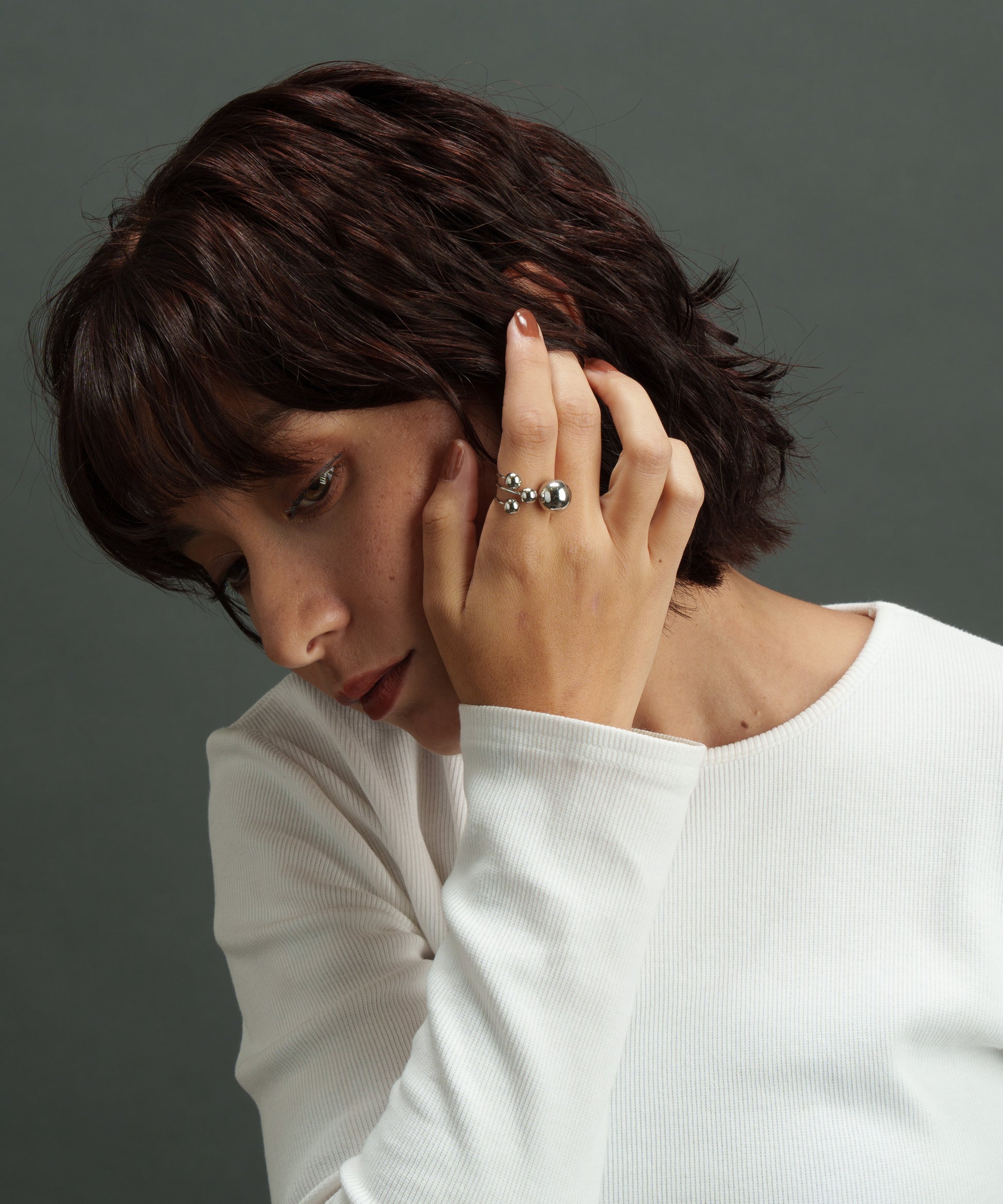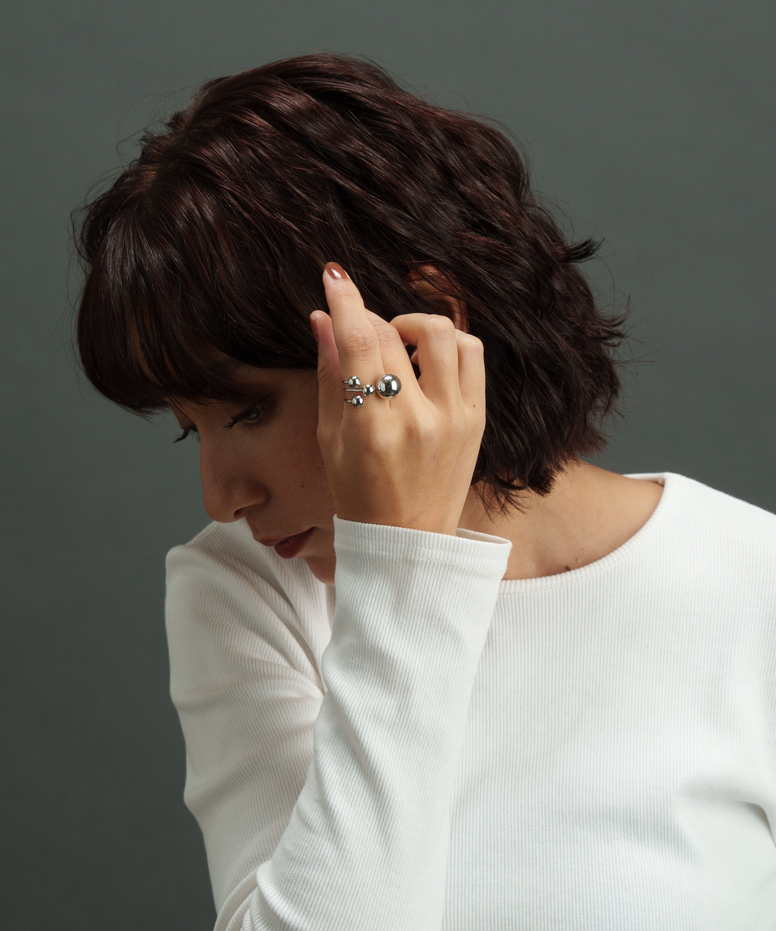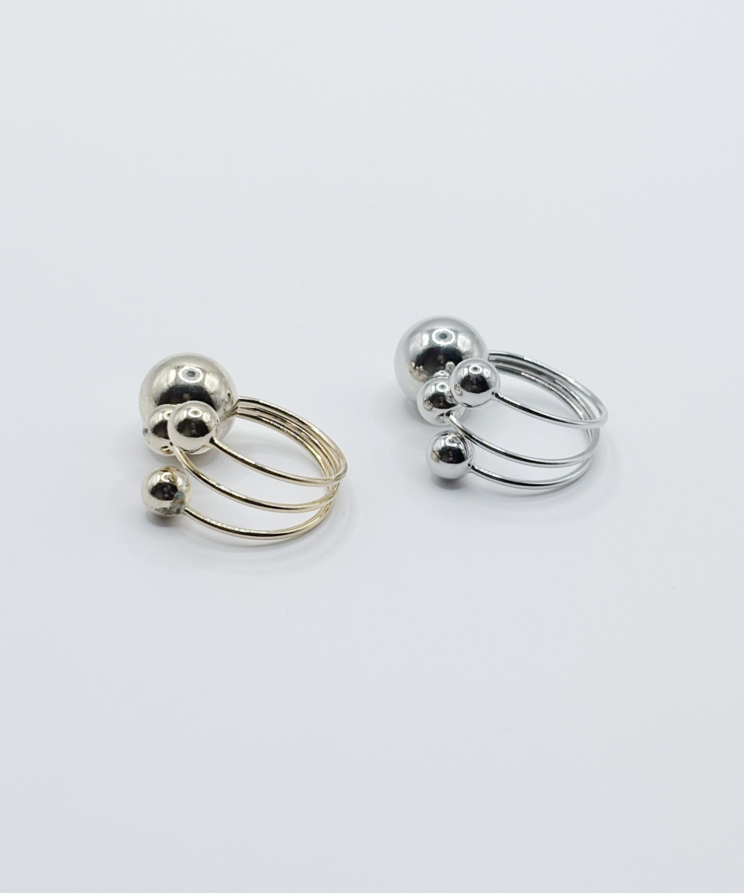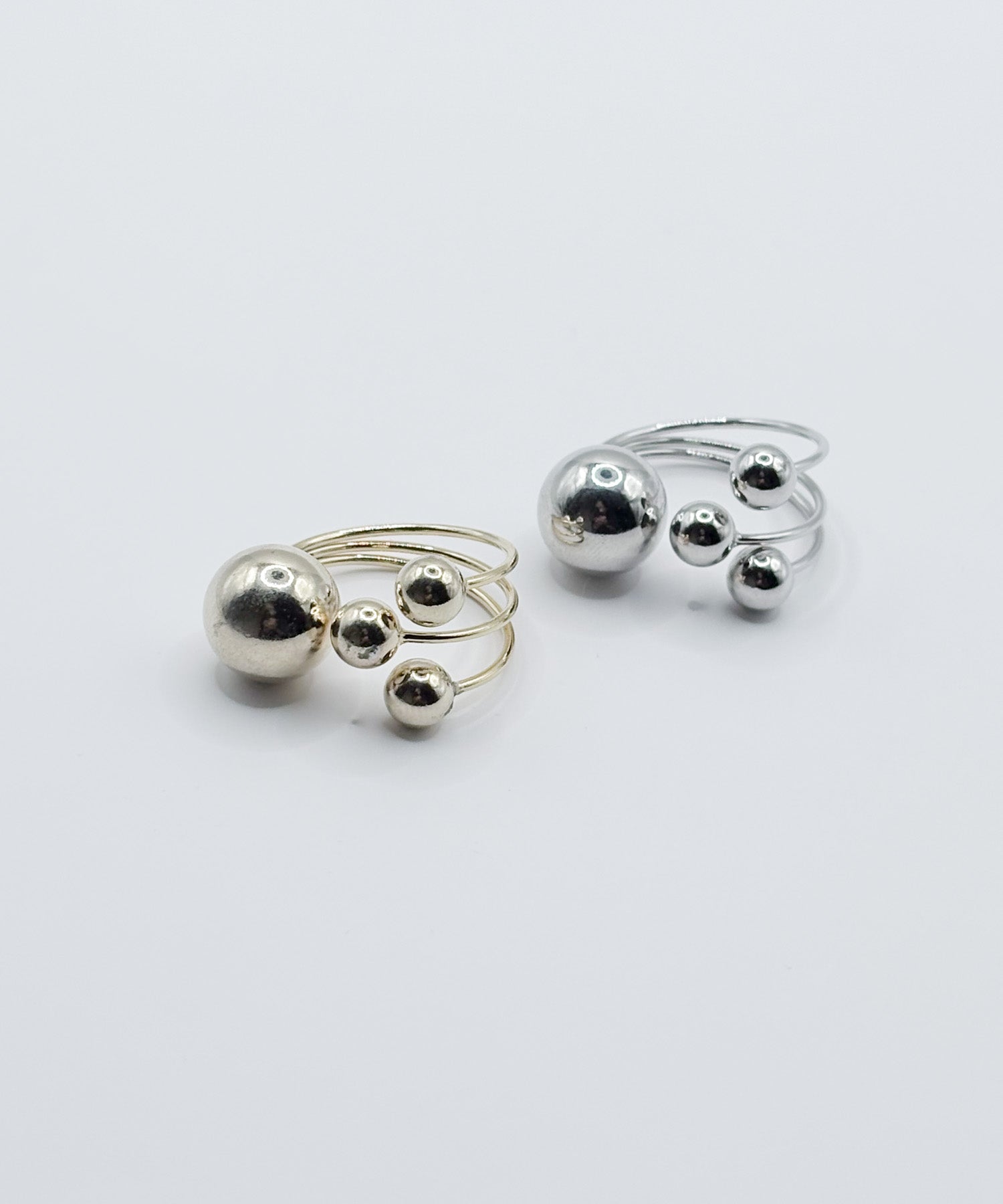 異なるサイズのボールを4つ先端に取り付けた構築的なデザイン。ミニマルでモードな手元をつくるリングです。