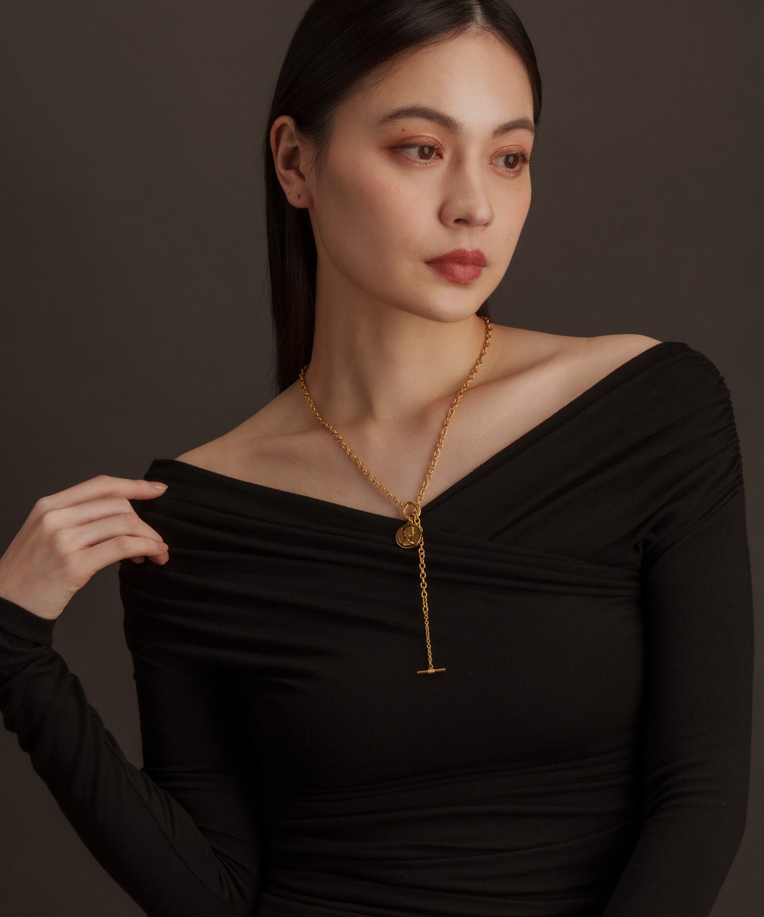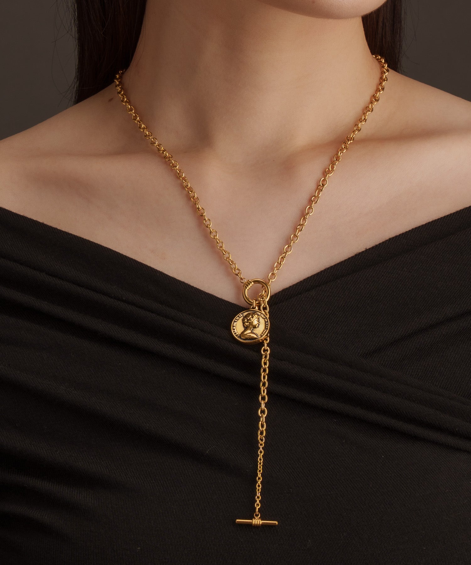 海外のコインをモチーフにしたY字タイプのネックレス。コーディネートに合わせ留める位置が変えられるよう、しっかりと長さがあります。