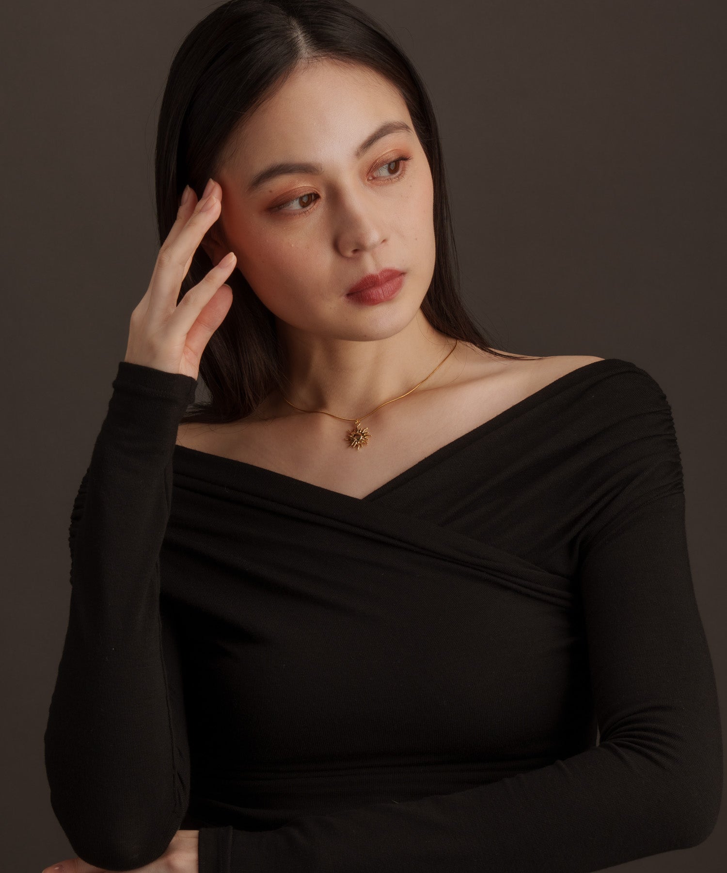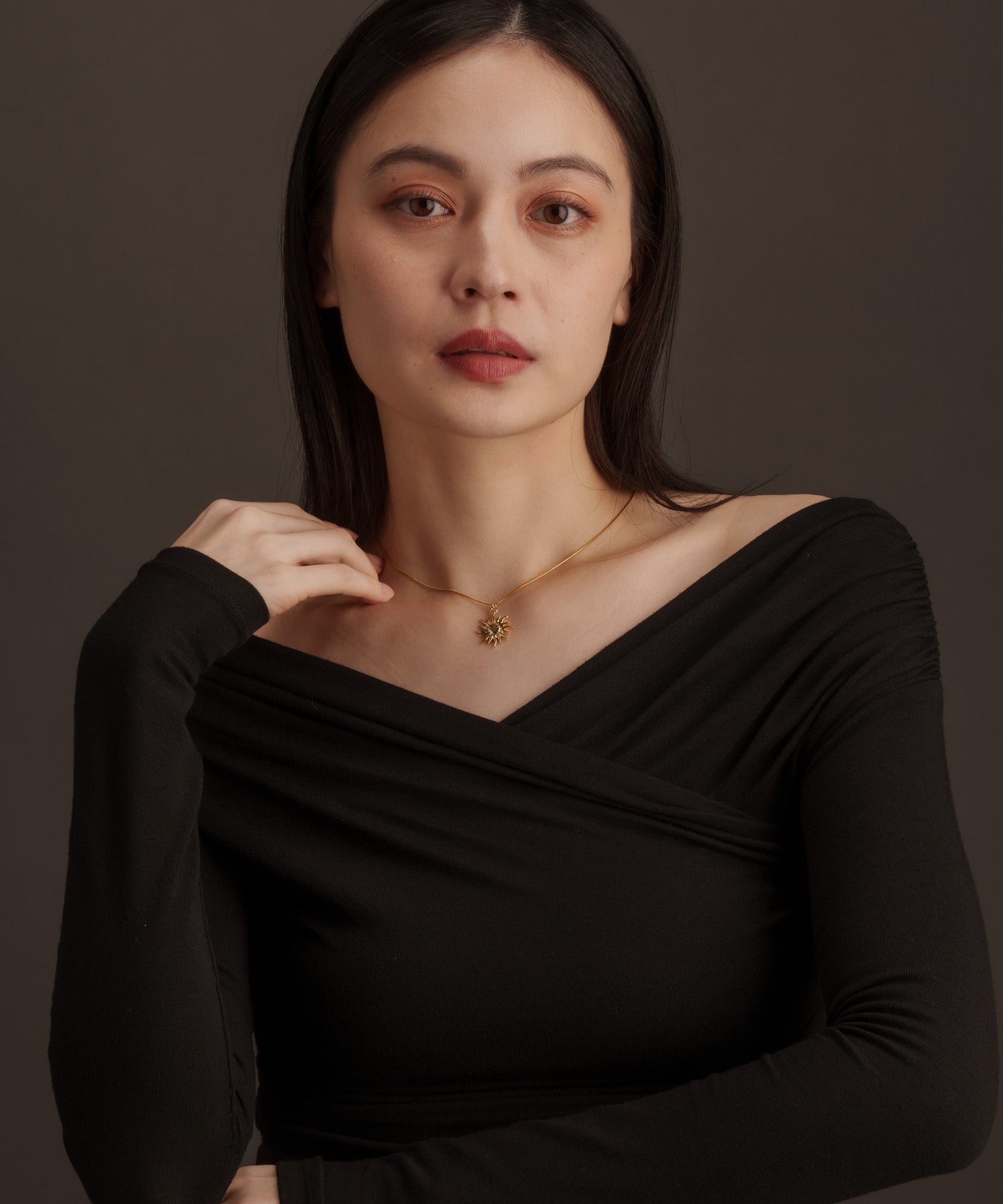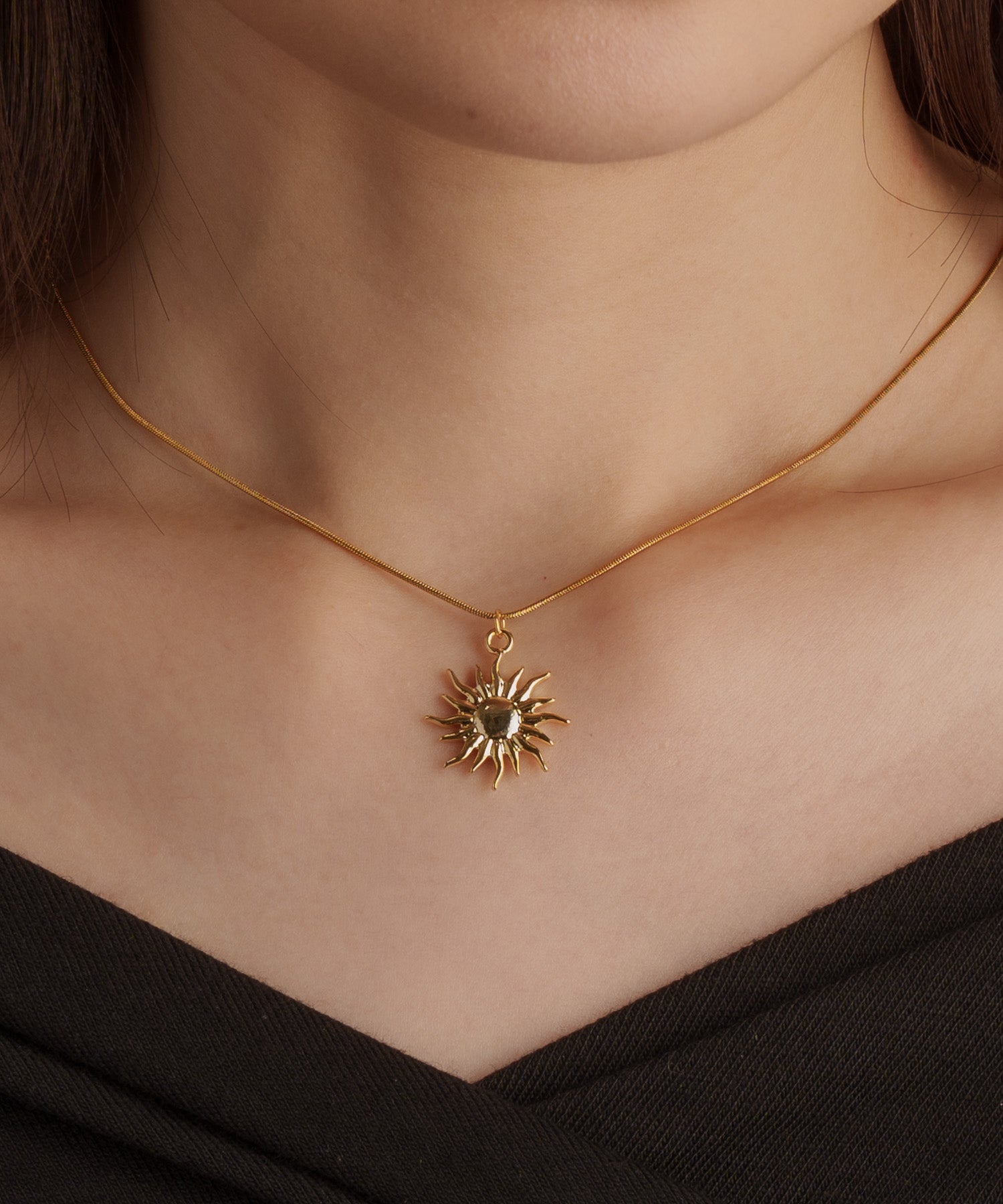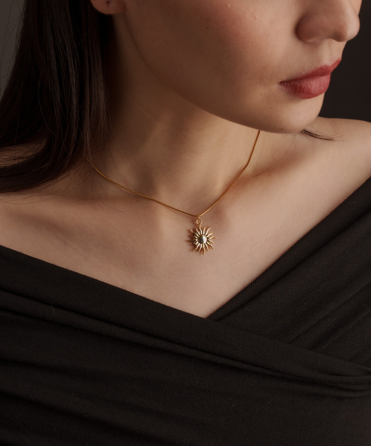 太陽モチーフがエネルギーを感じるネックレス。単品付けで目立たせるのも、レイヤードするにも丁度いいモチーフサイズです。
