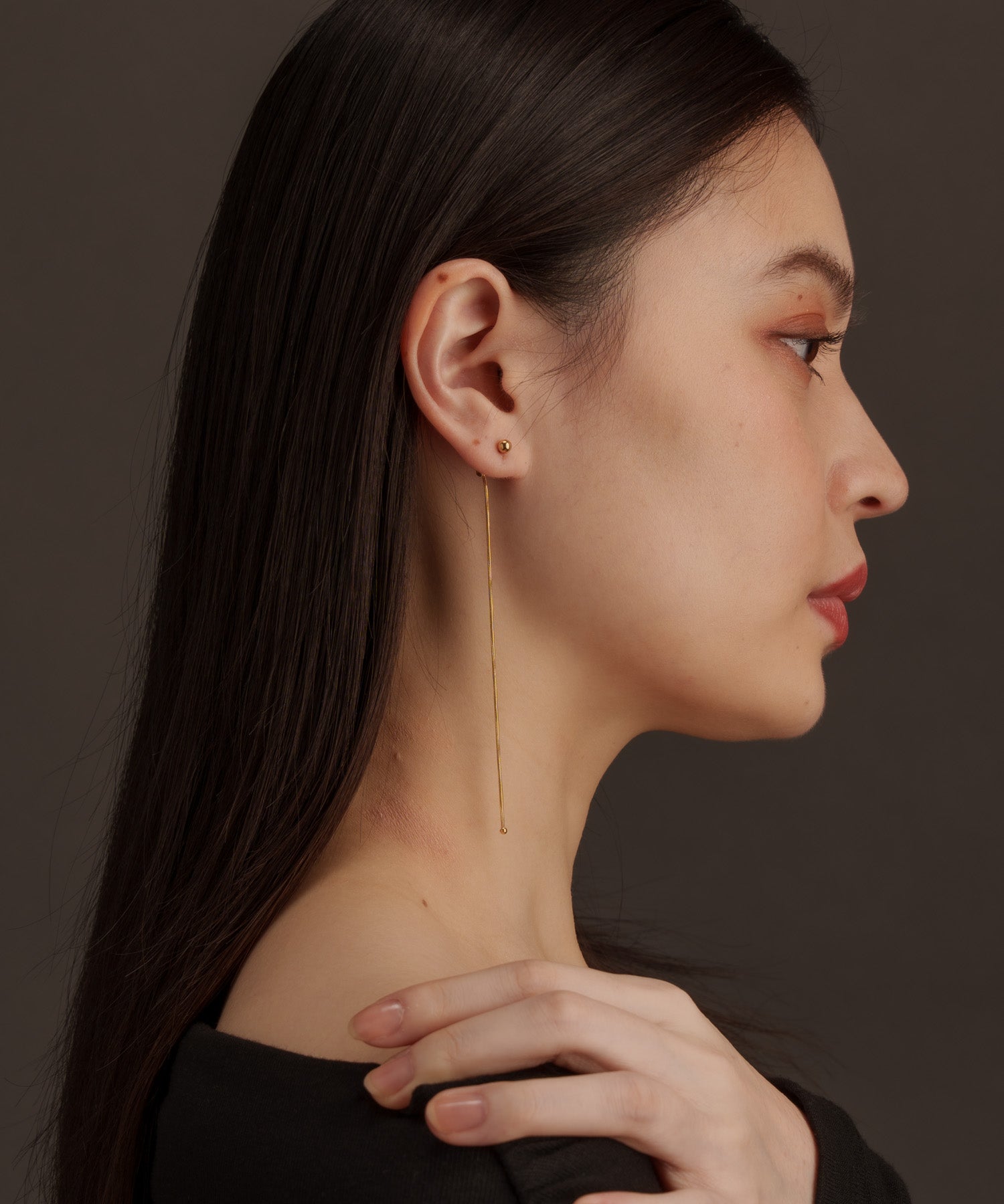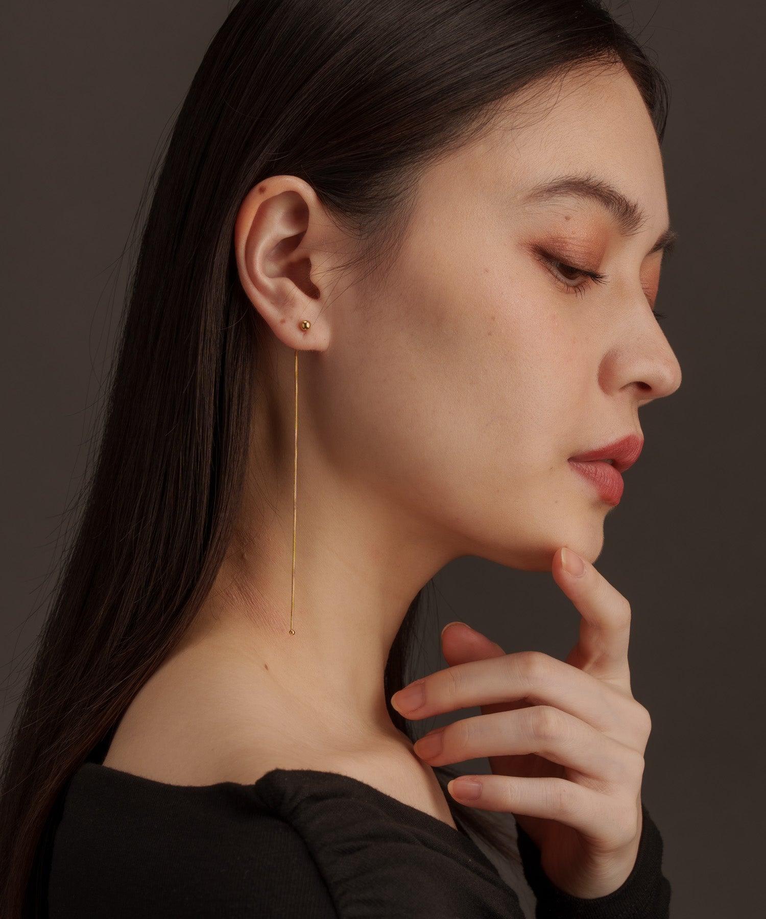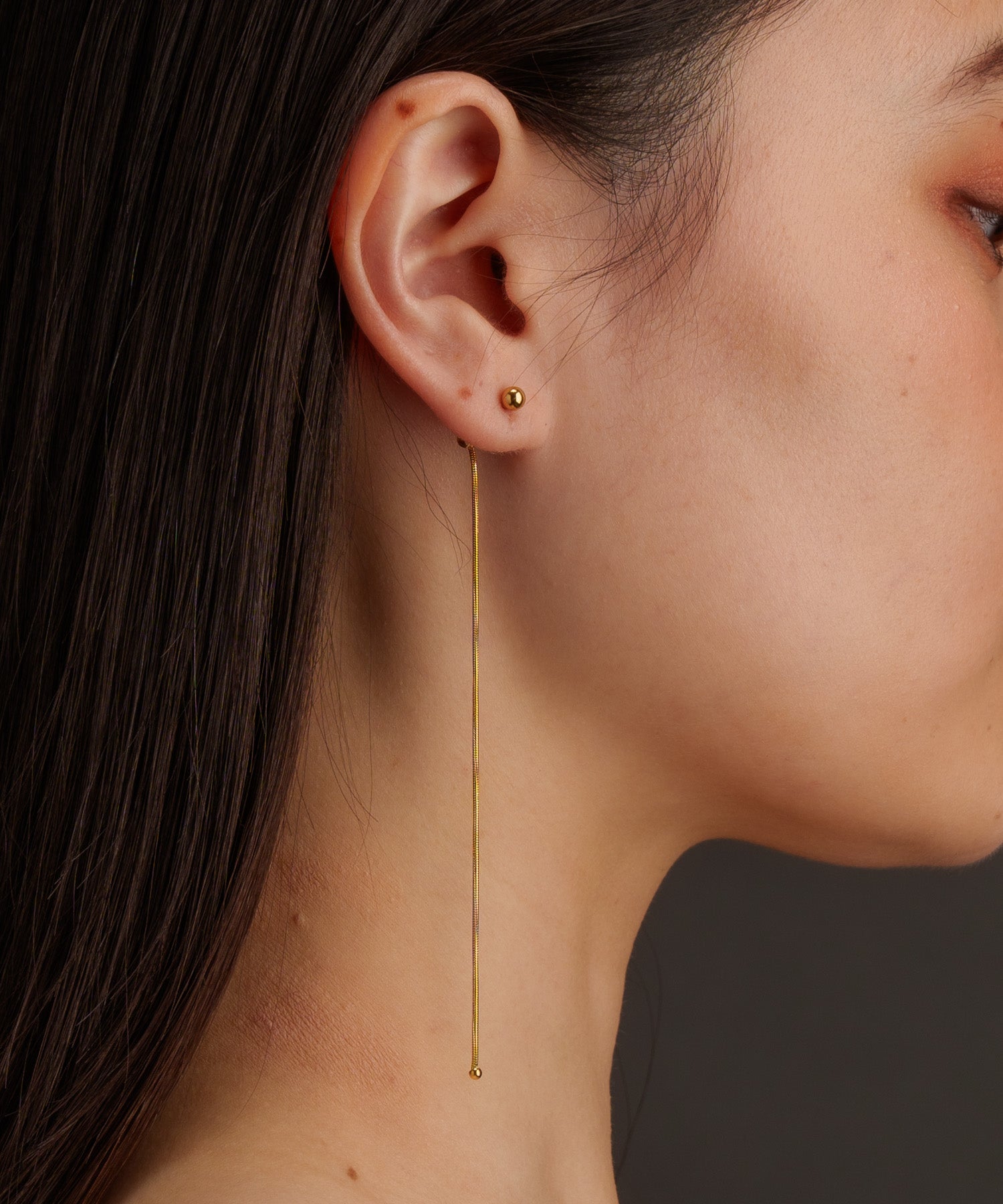 トップにボールが付けられたスネークチェーンピアス。流れるようなチェーンは、両耳はもちろん、あえて片耳だけ付けるスタイリッシュな使い方も。