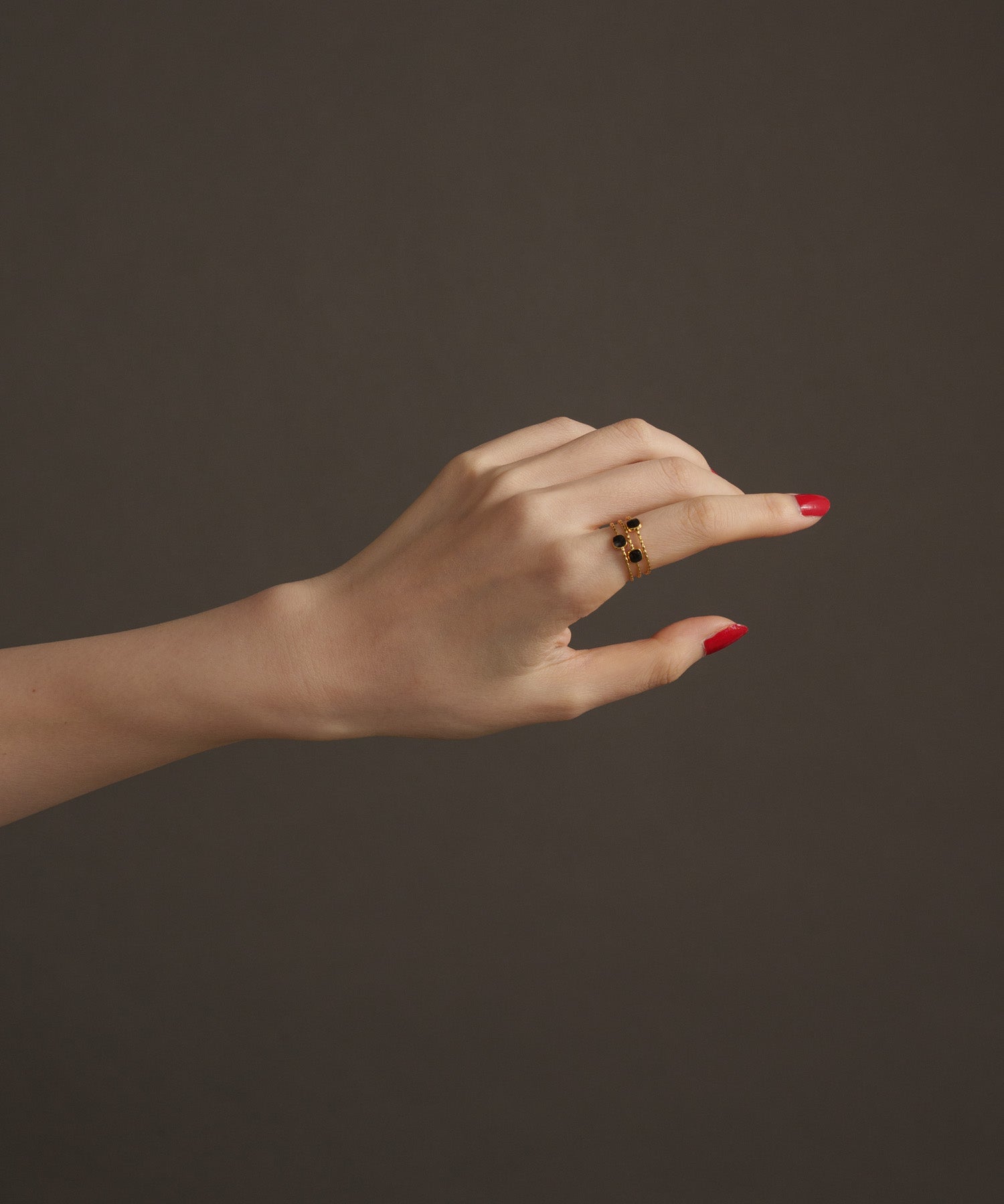 ボールチェーンが連結されたような3連リングにランダム配置されたストーン。様々な角度からデザインをお楽しみいただけます。