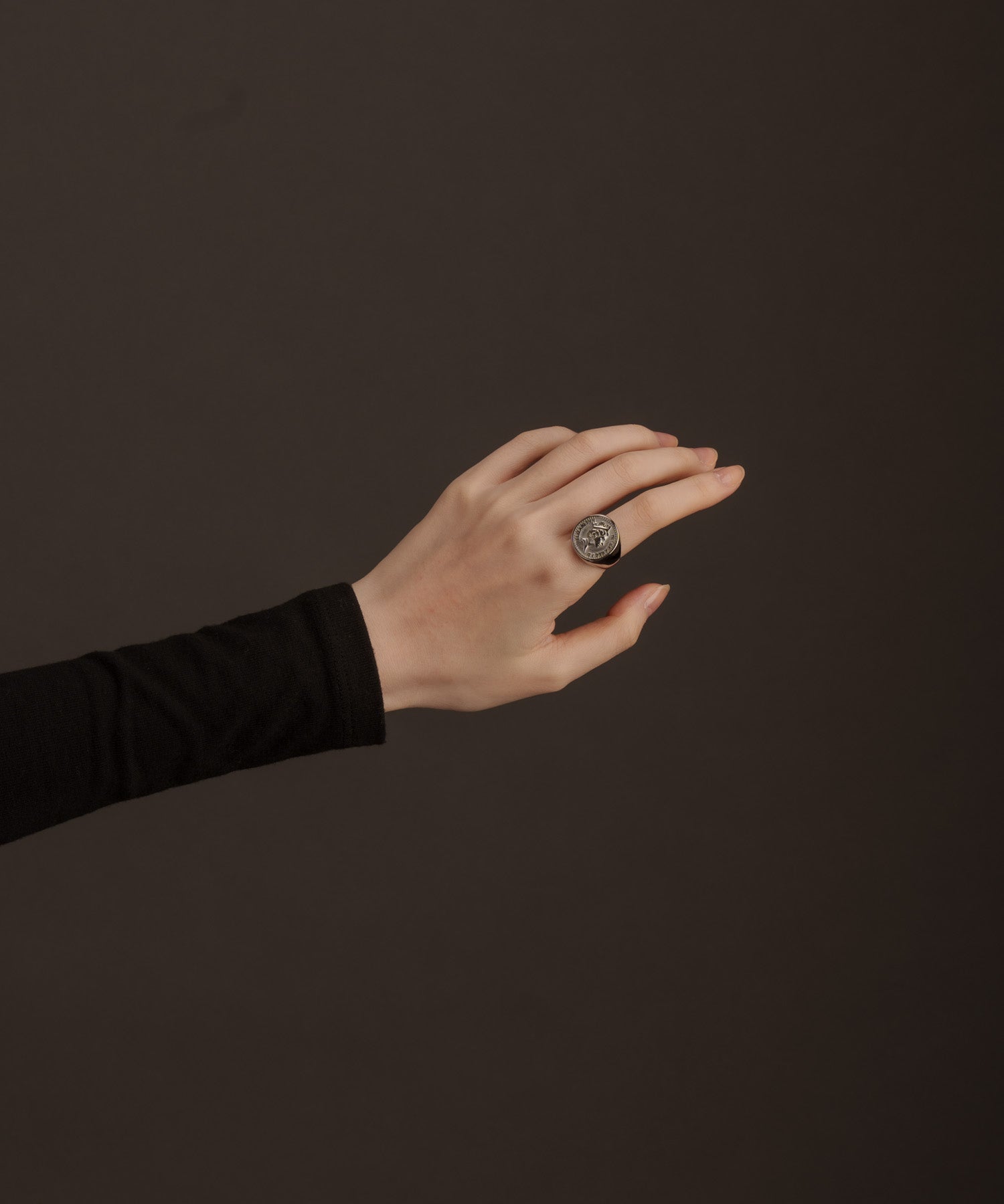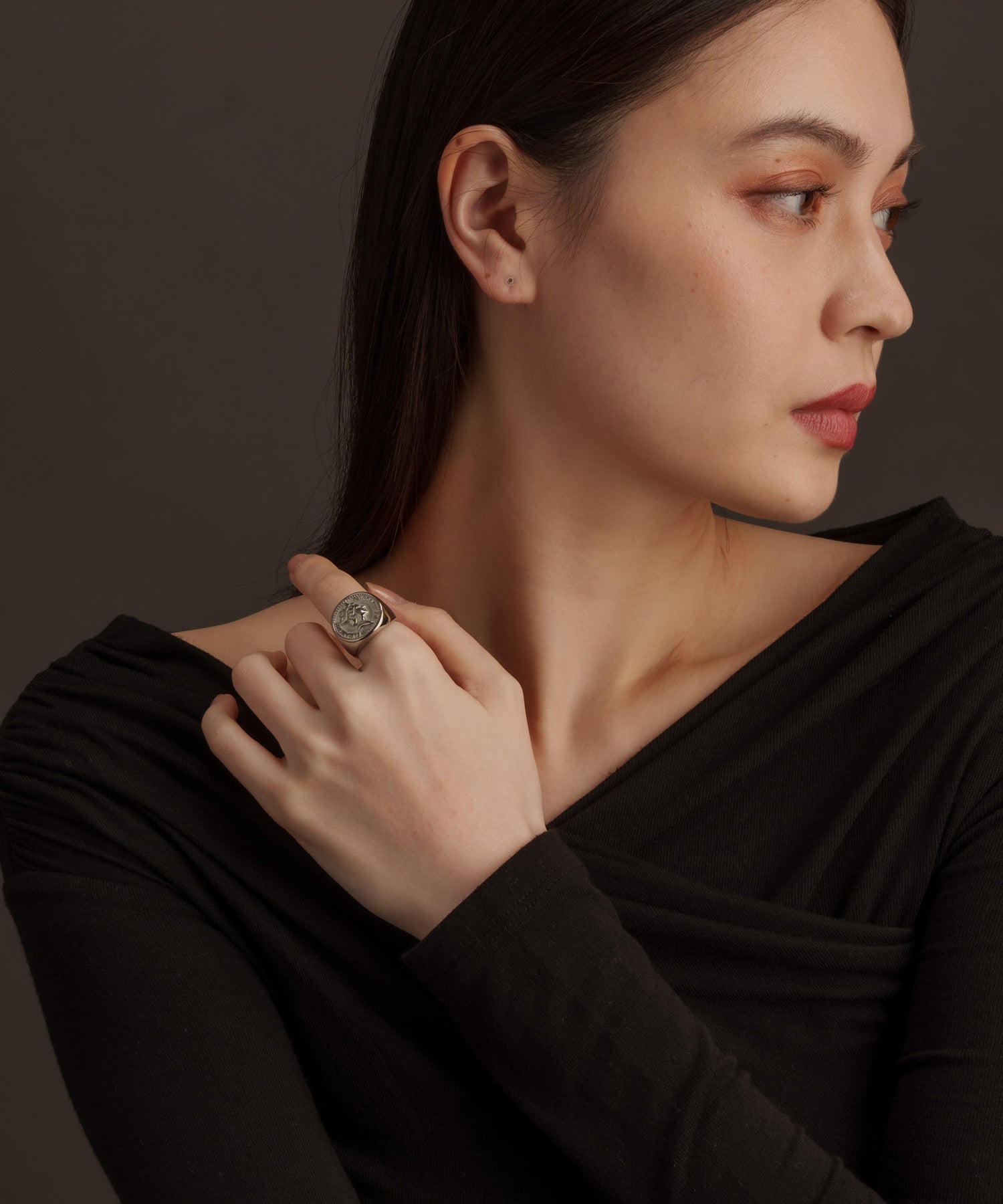 海外のコインをモチーフにしたリング。コイン部分にボリュームがあり、メンズライクでカジュアルな装いにもぴったり。男性にもおすすめのデザインです。