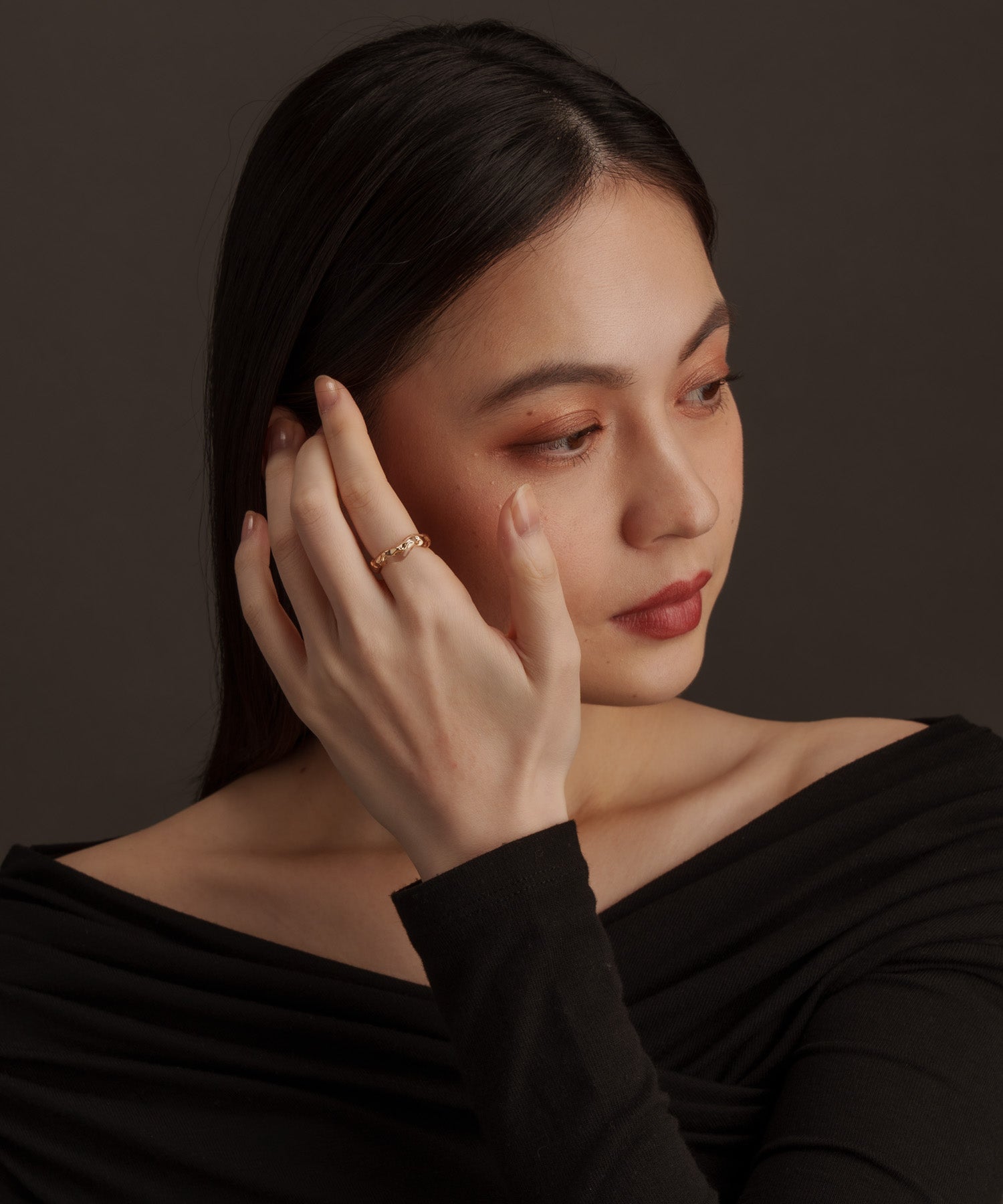 デコボコした表面が特徴的なリング。中の金属と樹脂幅がほぼ同じで重ね付けにも向いています。