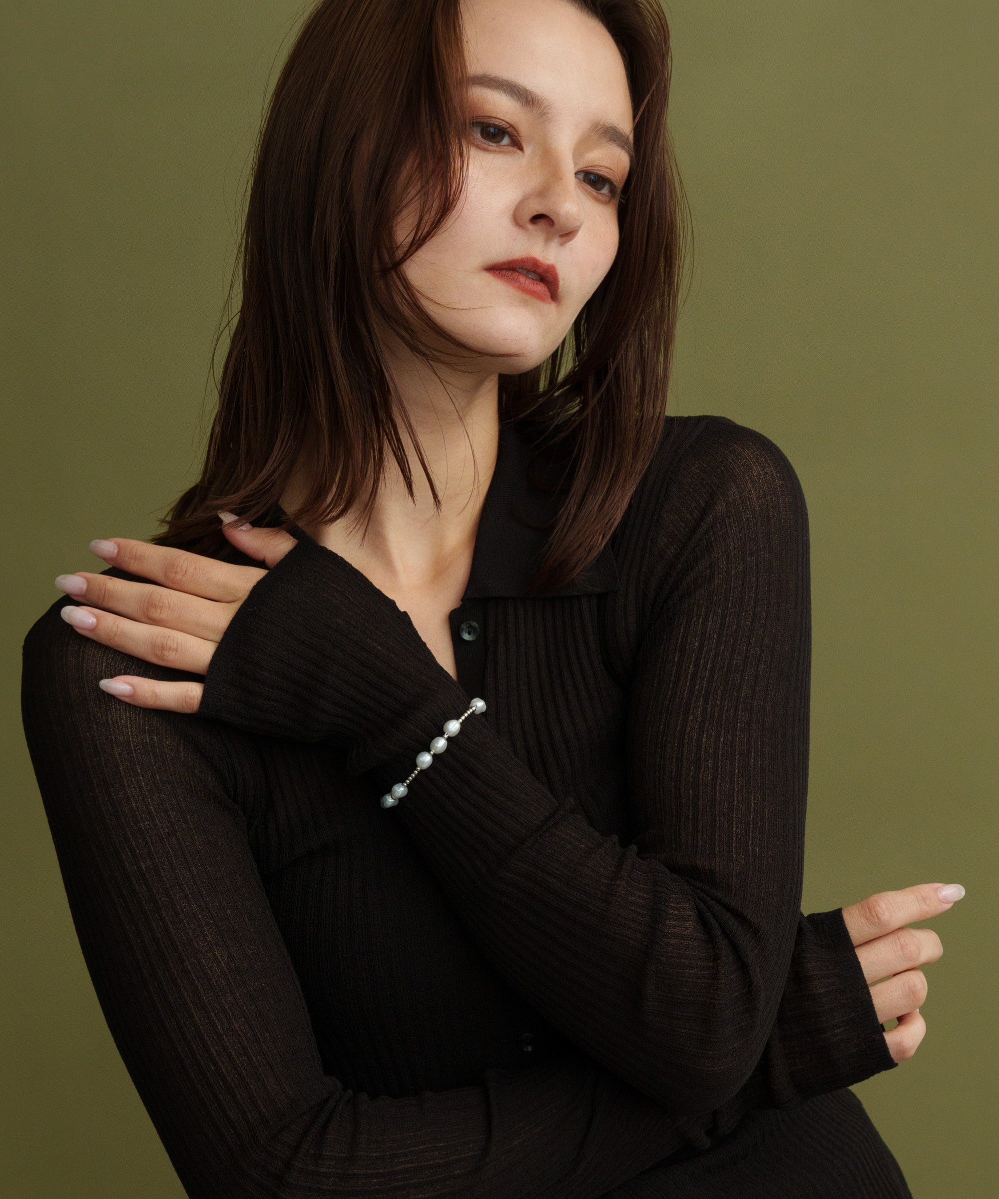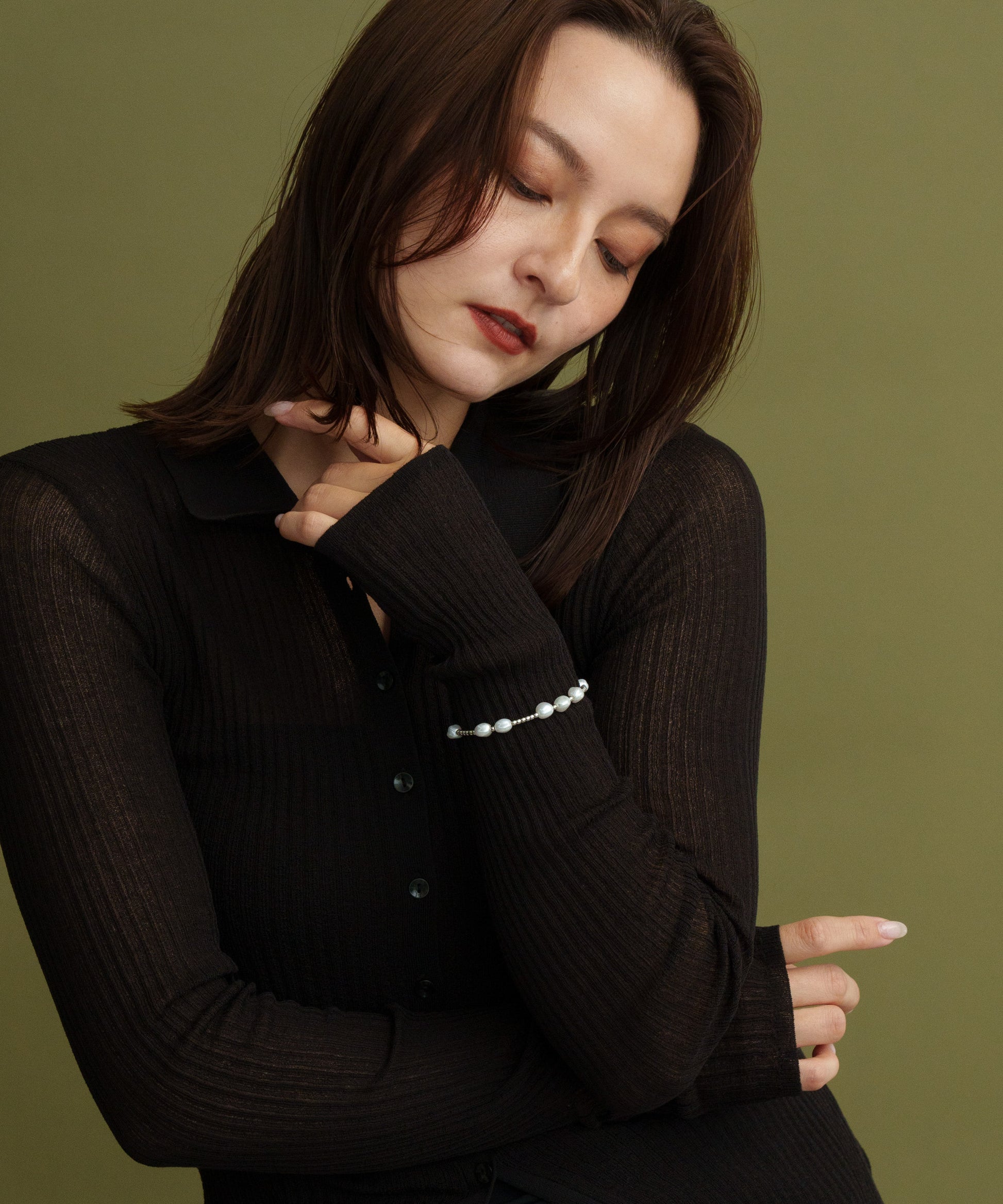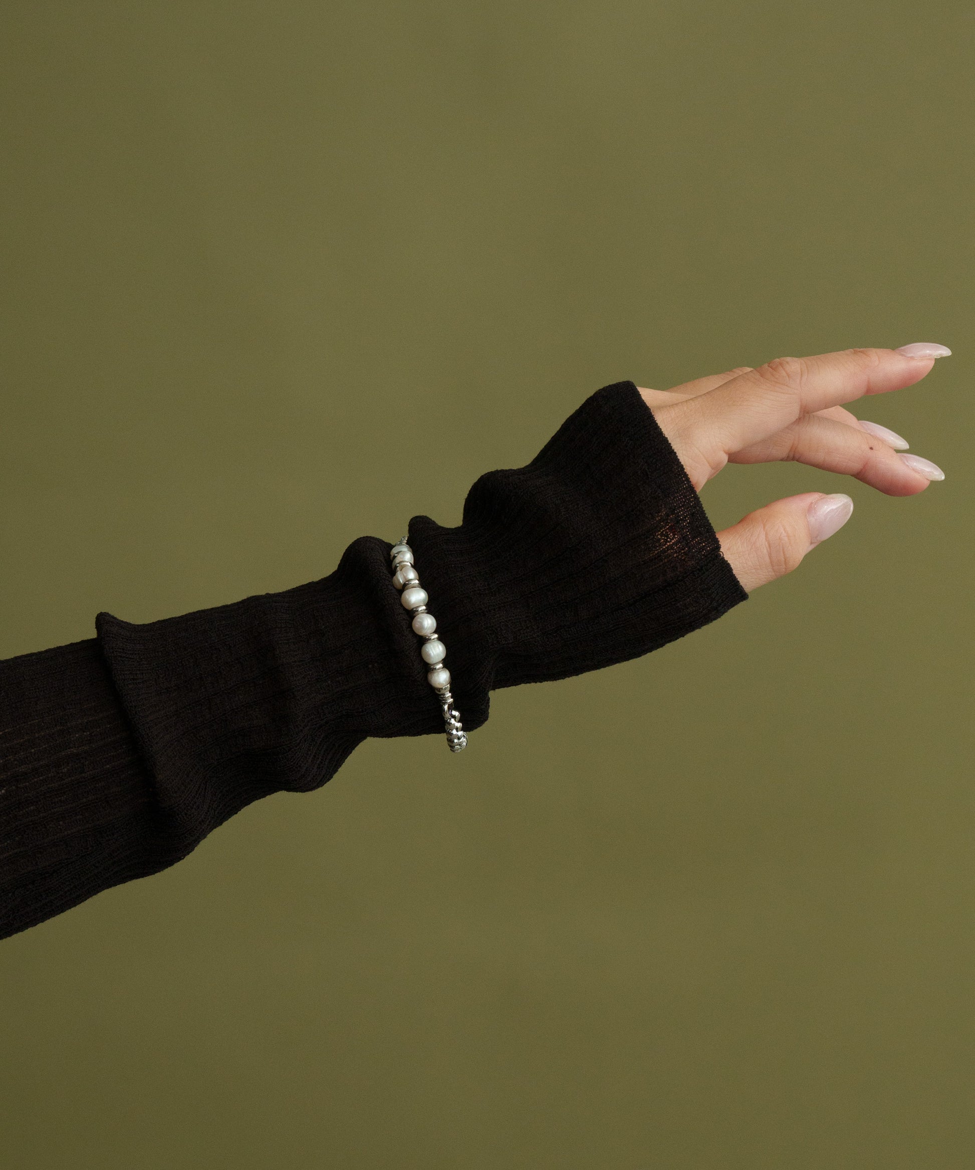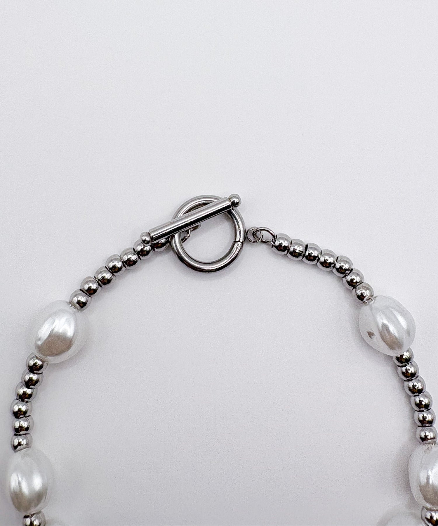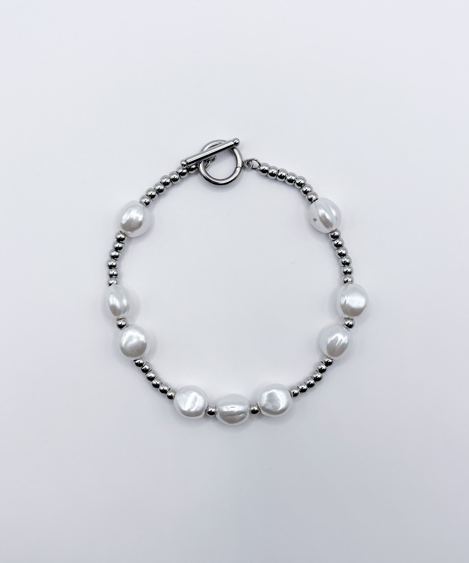 ボールチェーンにパールライクパーツをあしらったブレスレット。Tバーと丸カンで簡単に着脱できます。
