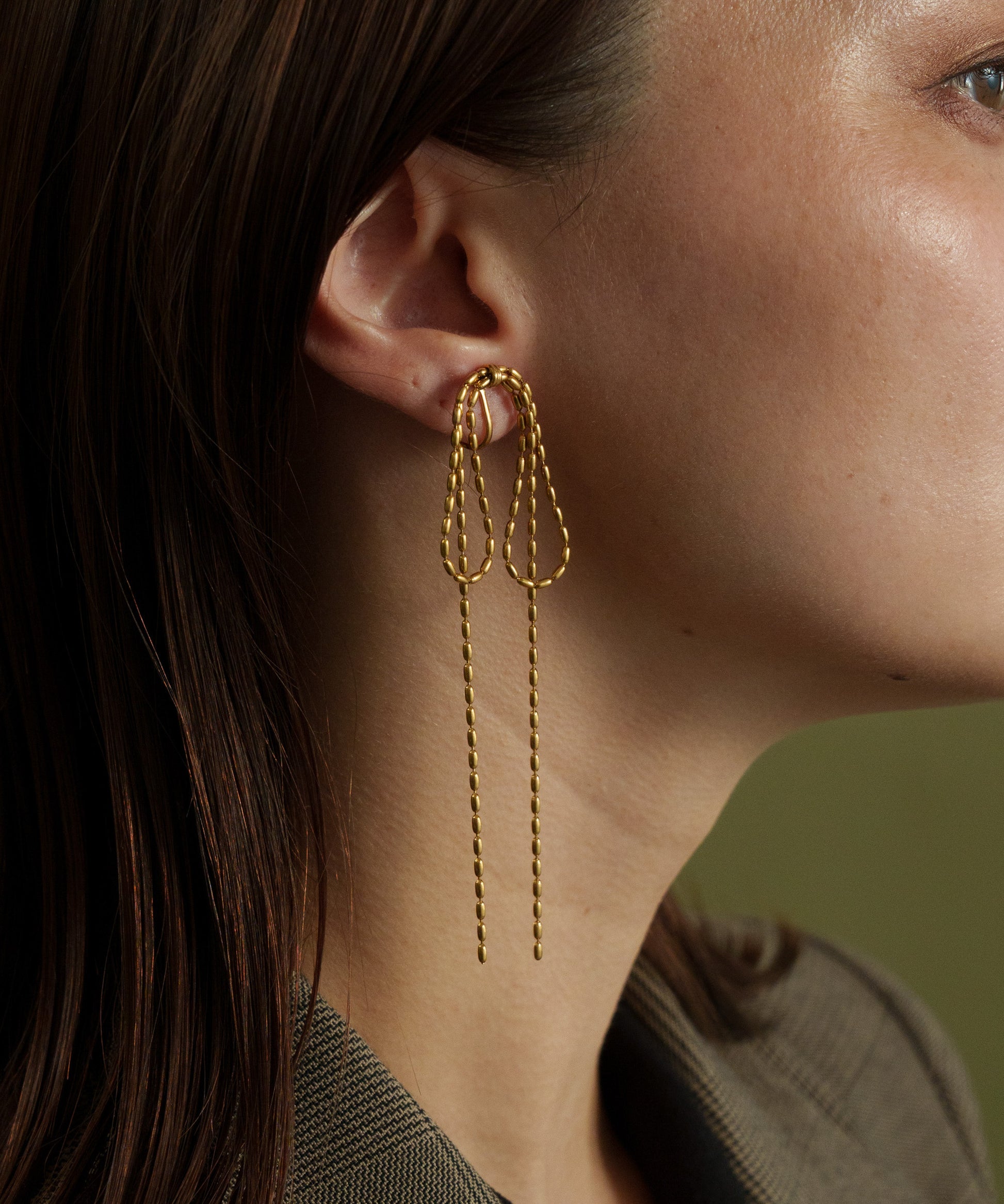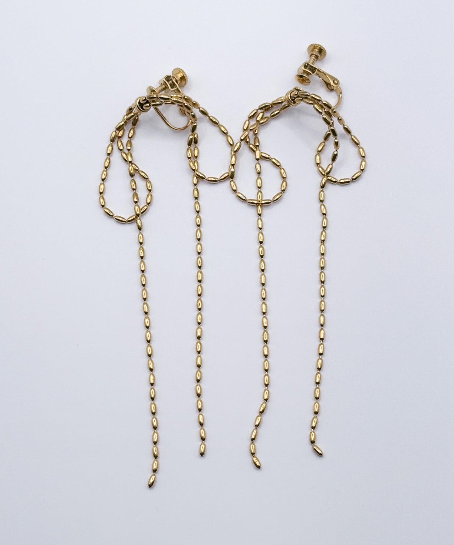 ボールチェーンより上品さを感じさせる楕円形状のライスチェーン。流れる様に落ちるリボンが耳元を華やかにしてくれます。