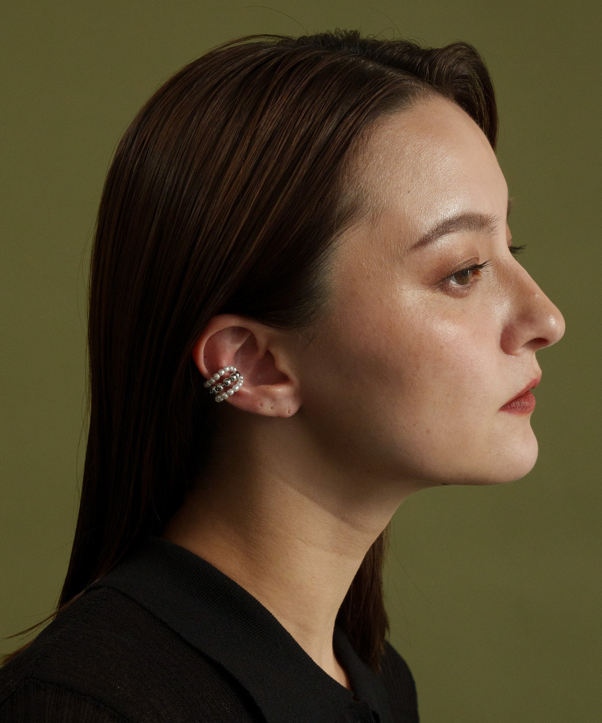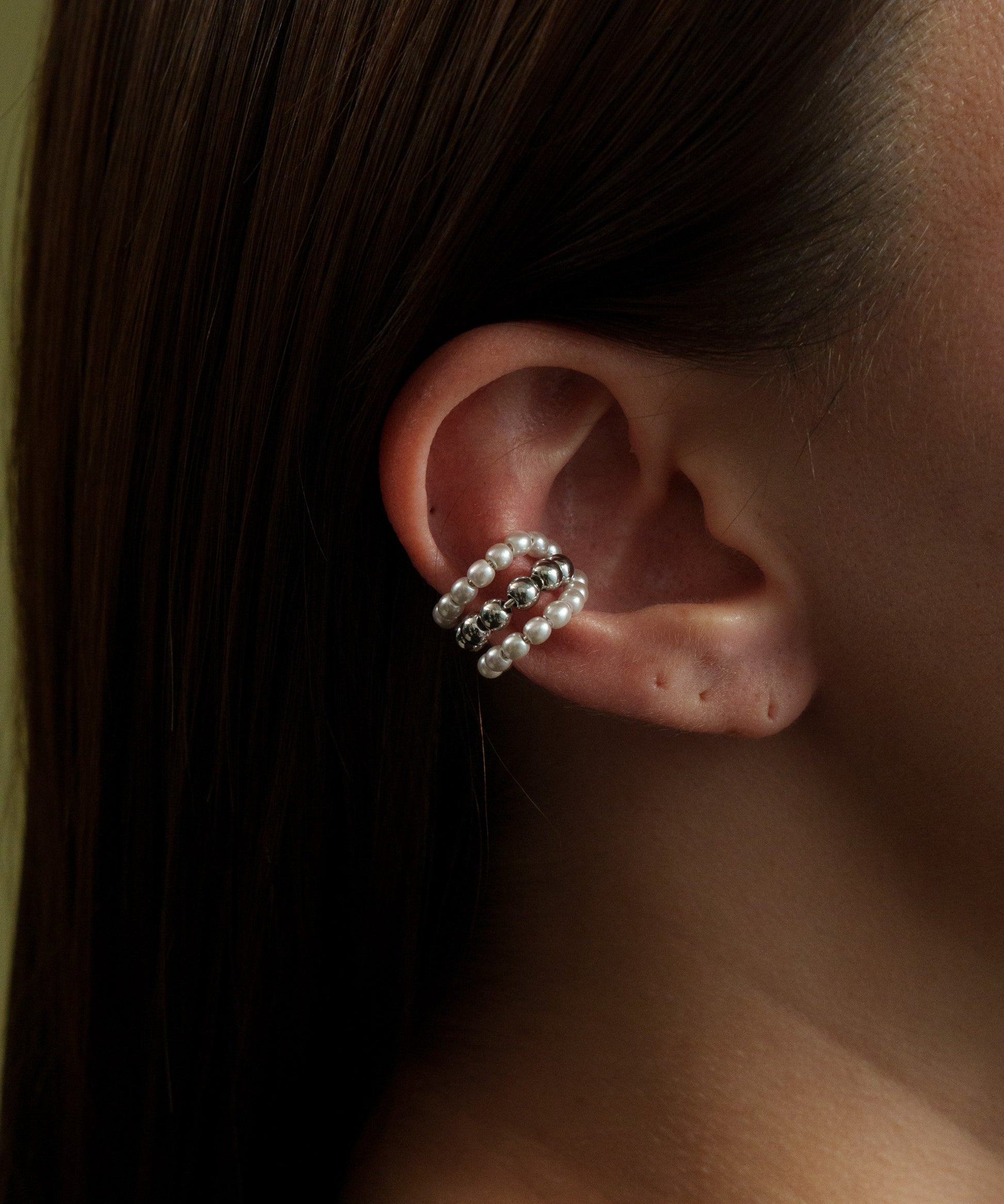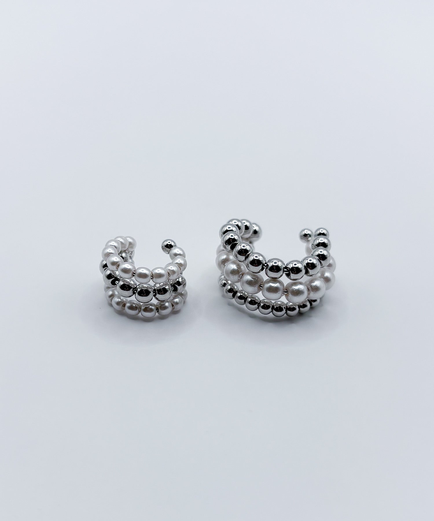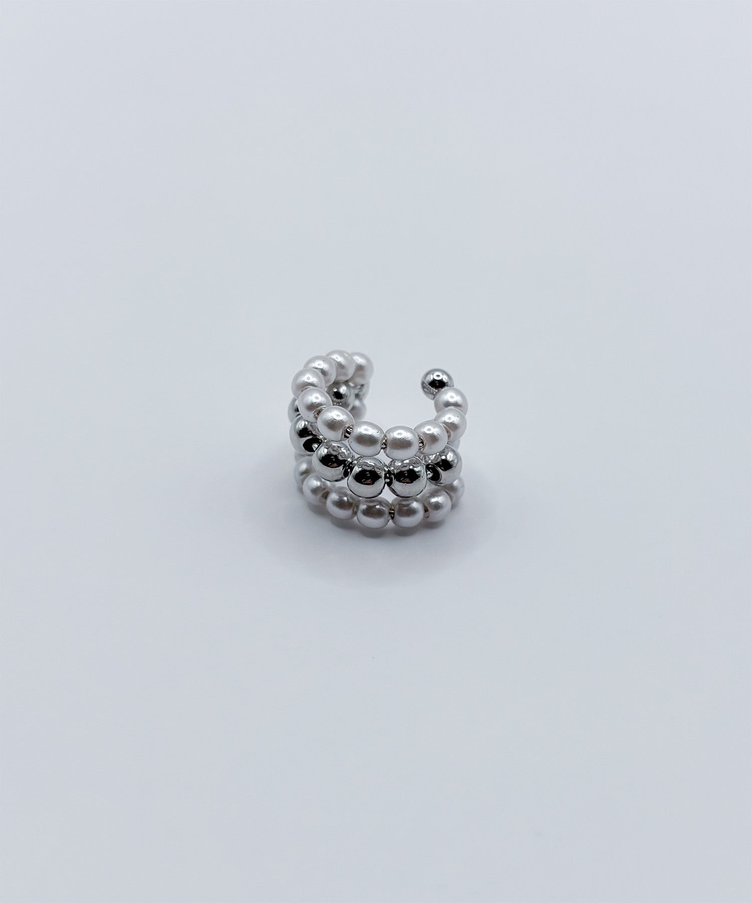 コロンと丸いパールボールが愛らしい小さめイヤーカフ。金属ボールをパールで挟み耳元を上品で華やかに。