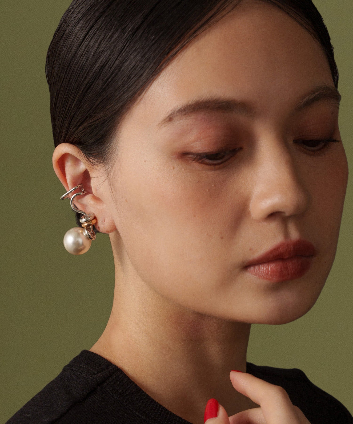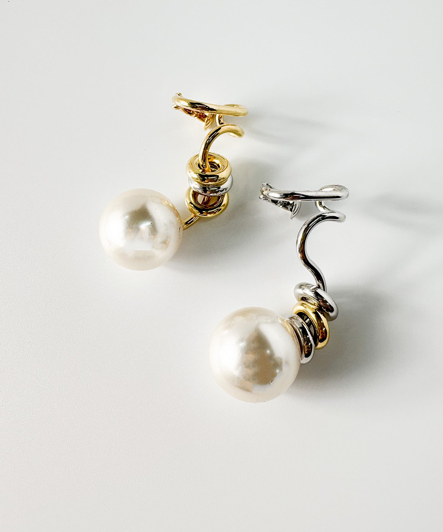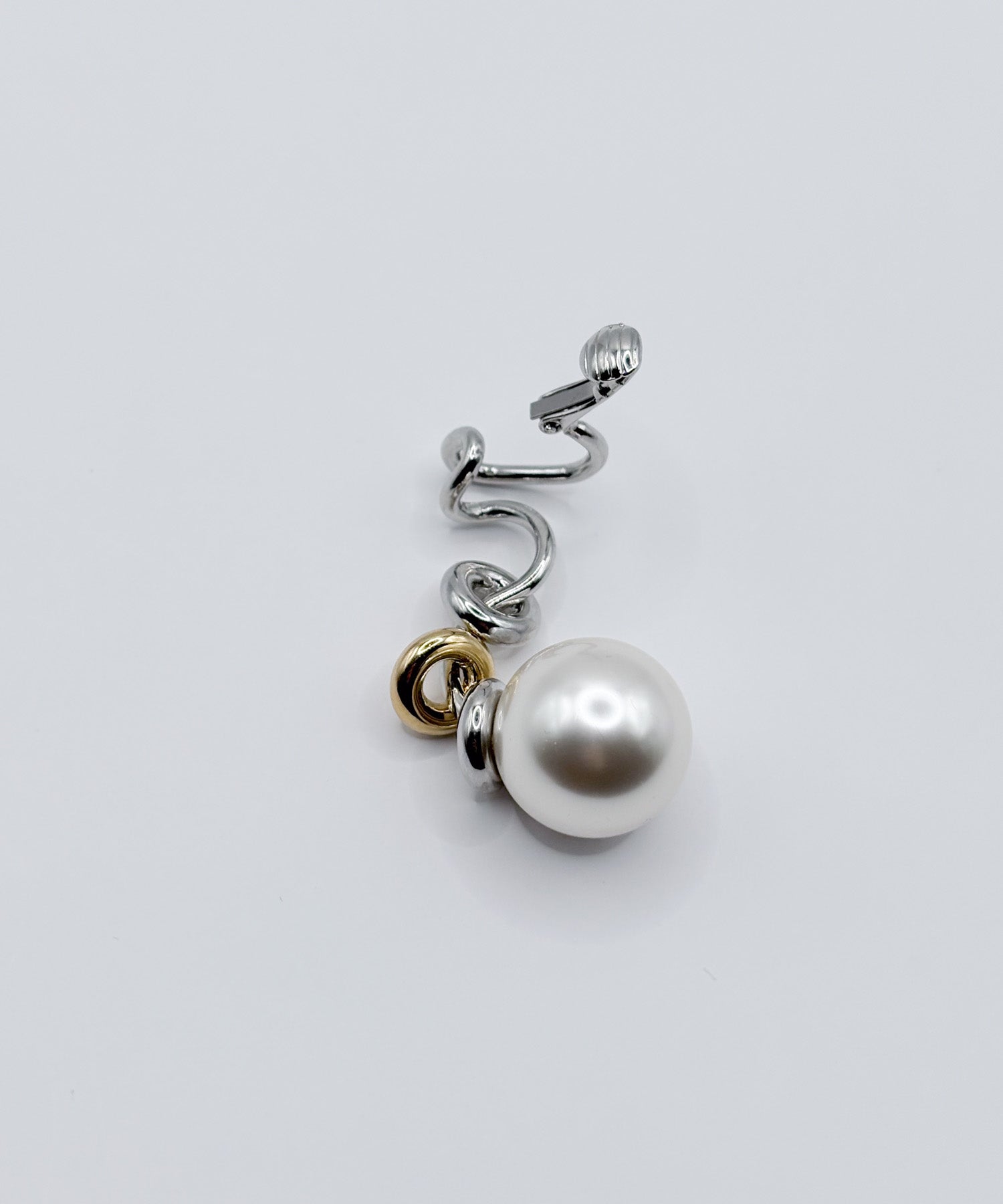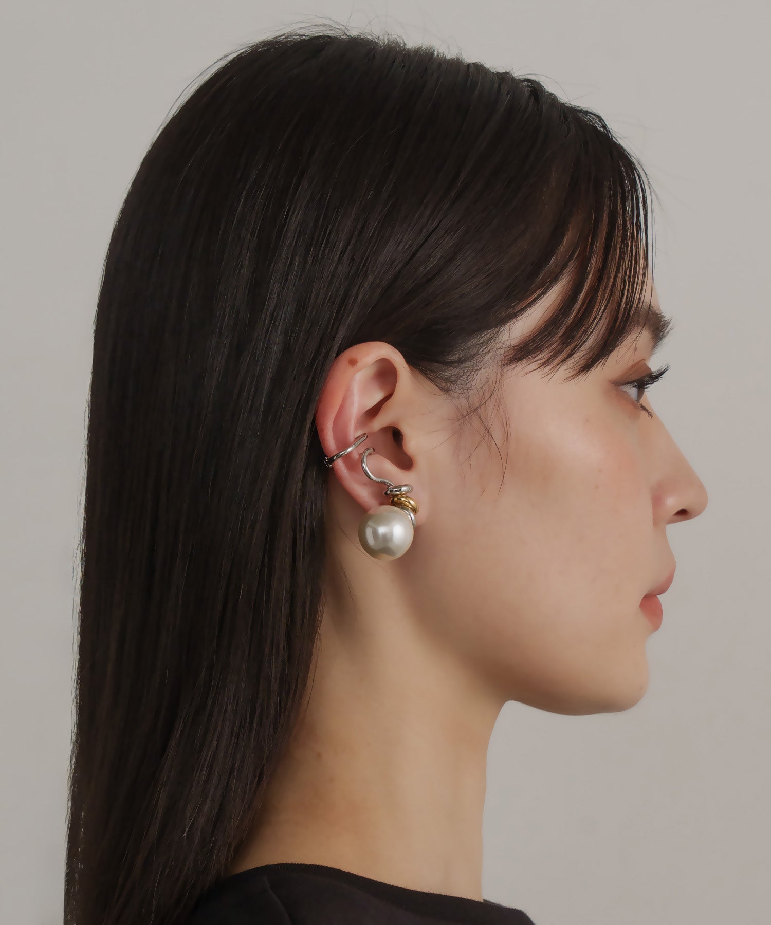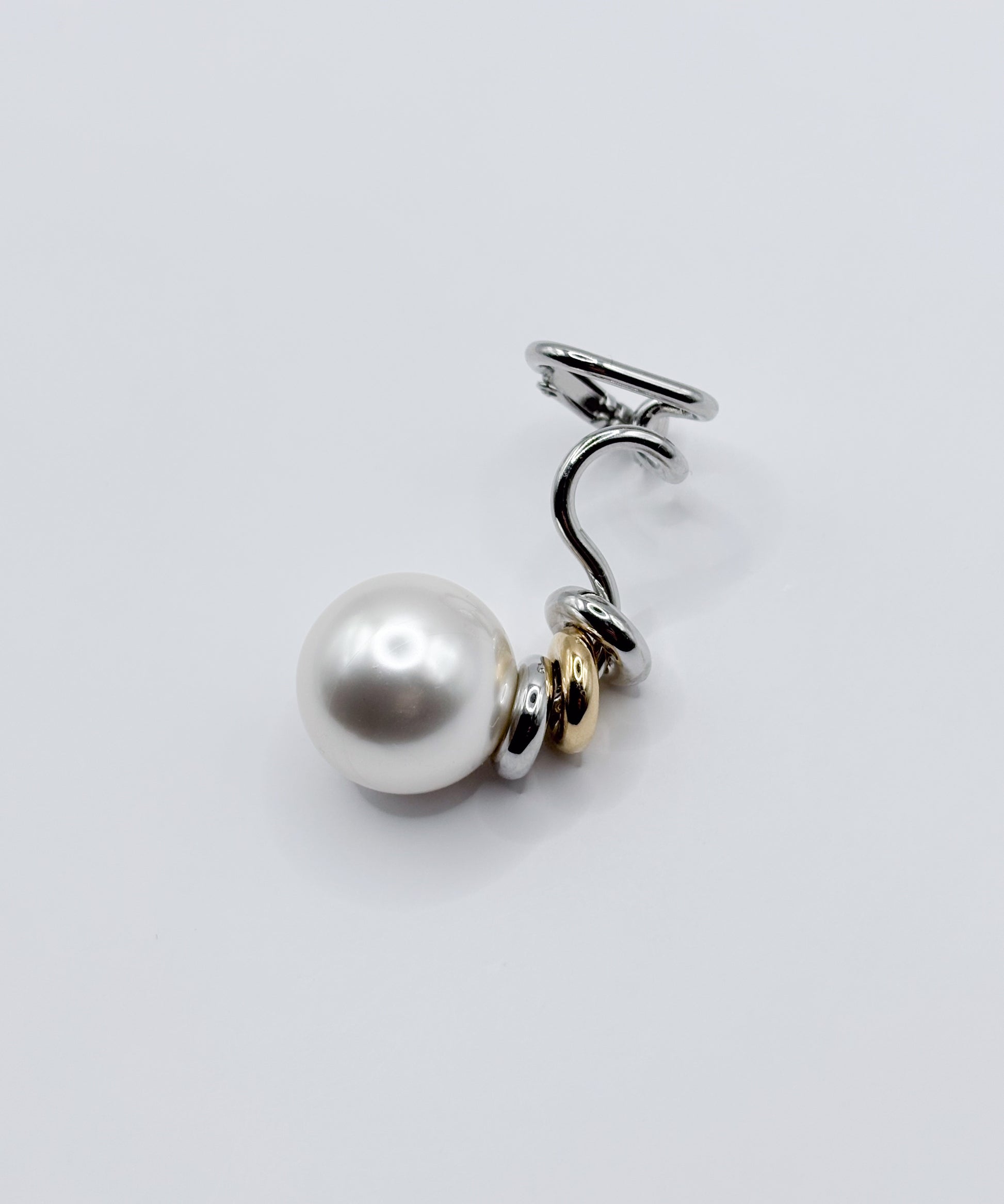 デザイン性が高く単品付けでも主役級になるイヤーカフ。大ぶりな人工パールが耳たぶに来るように耳の中央で挟むタイプです。こちらは右耳用です。