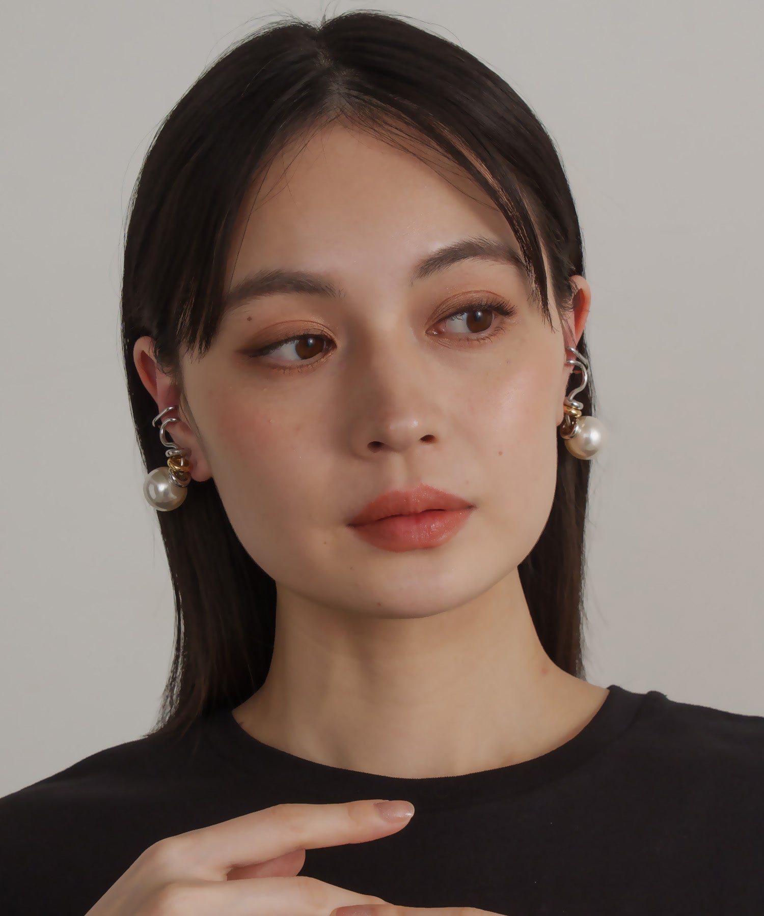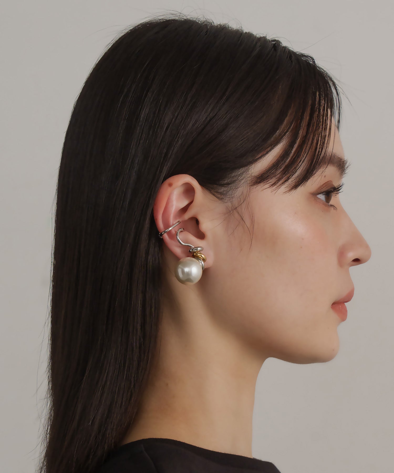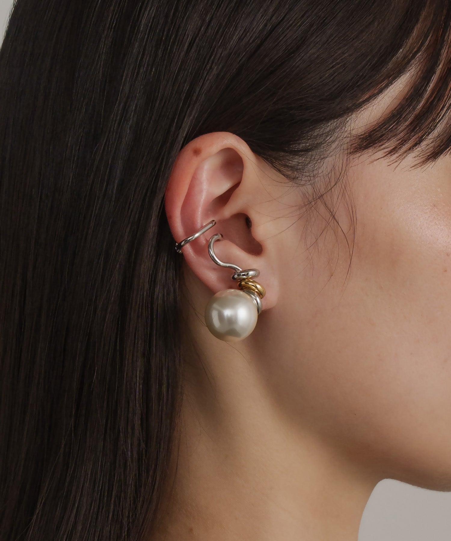 デザイン性が高く単品付けでも主役級になるイヤーカフ。大ぶりな人工パールが耳たぶに来るように耳の中央で挟むタイプです。こちらは両耳SETでの販売です。