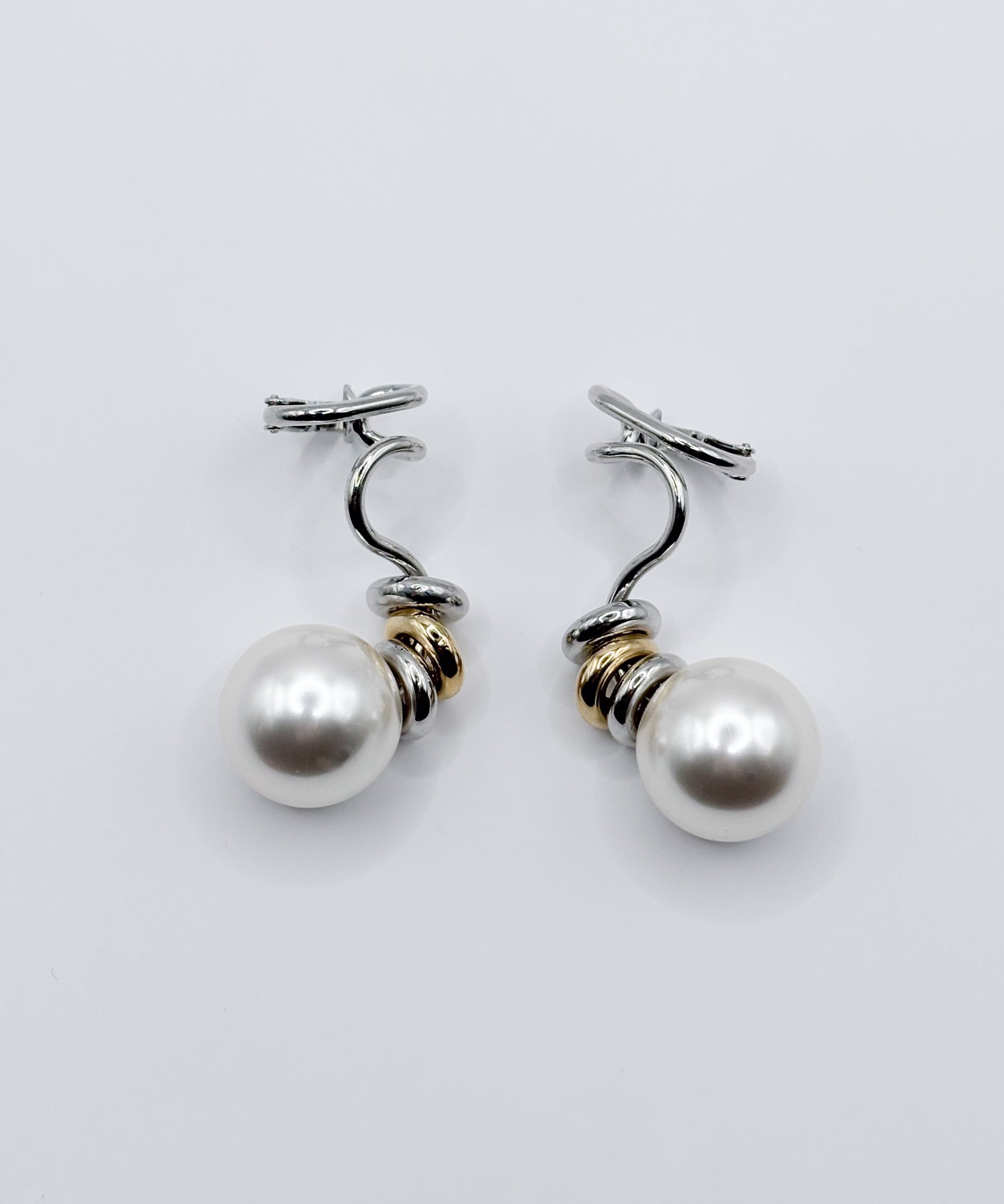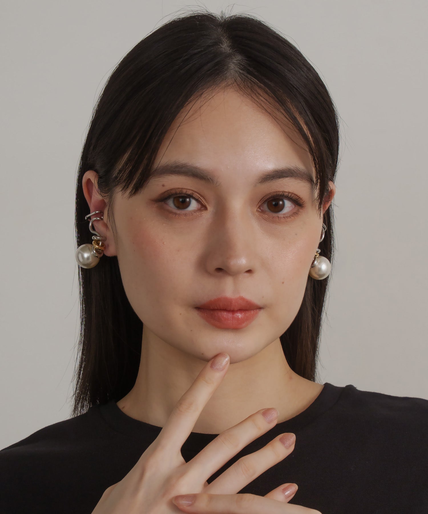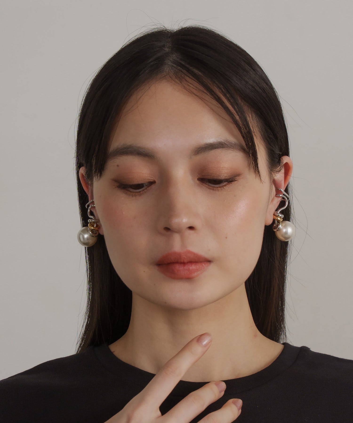 デザイン性が高く単品付けでも主役級になるイヤーカフ。大ぶりな人工パールが耳たぶに来るように耳の中央で挟むタイプです。こちらは両耳SETでの販売です。