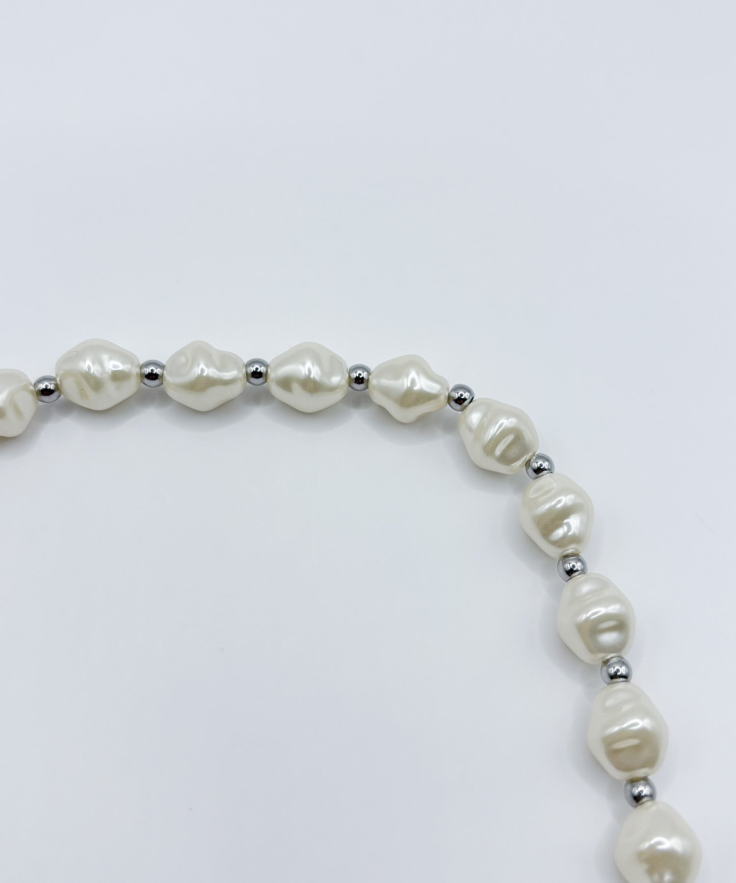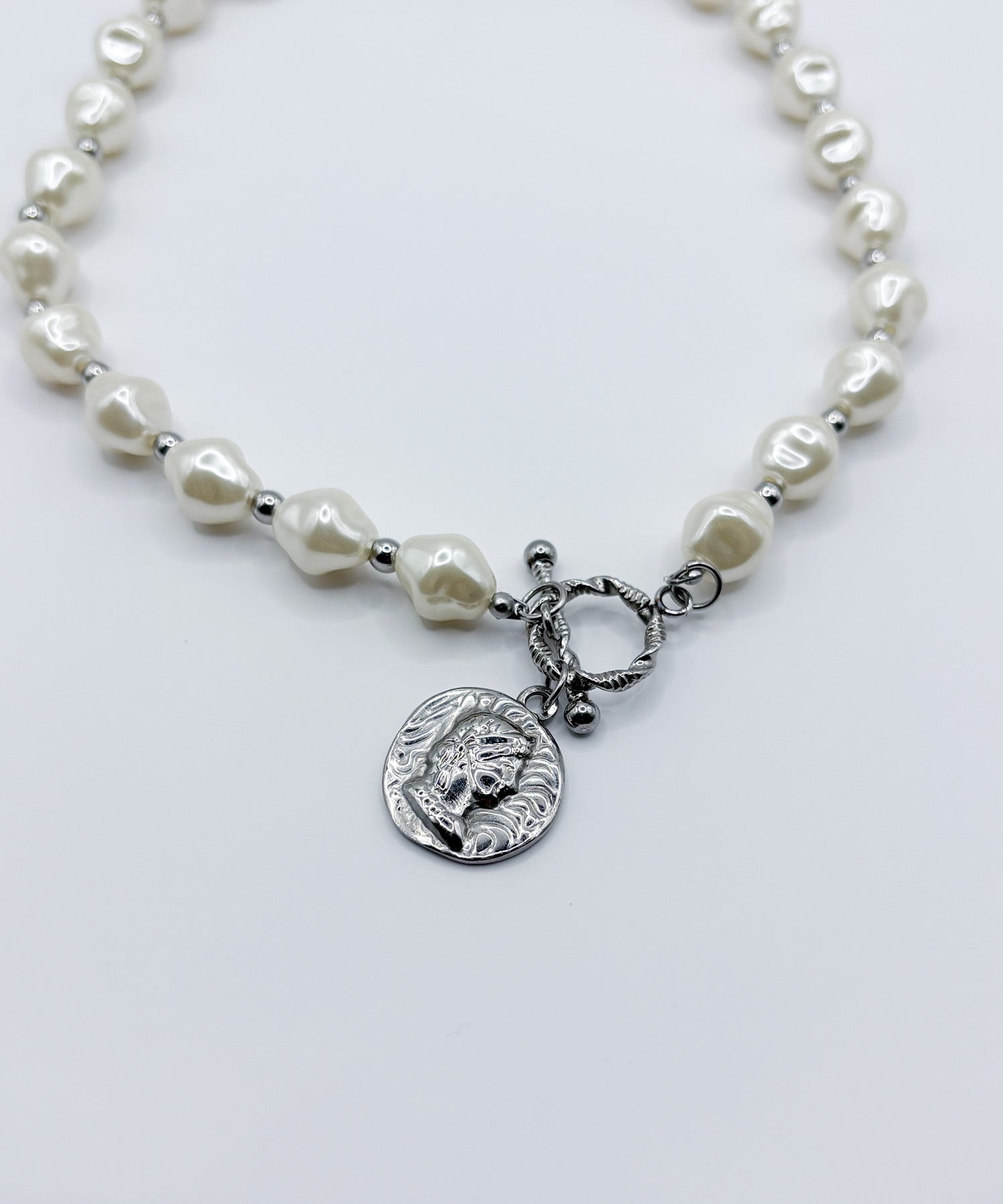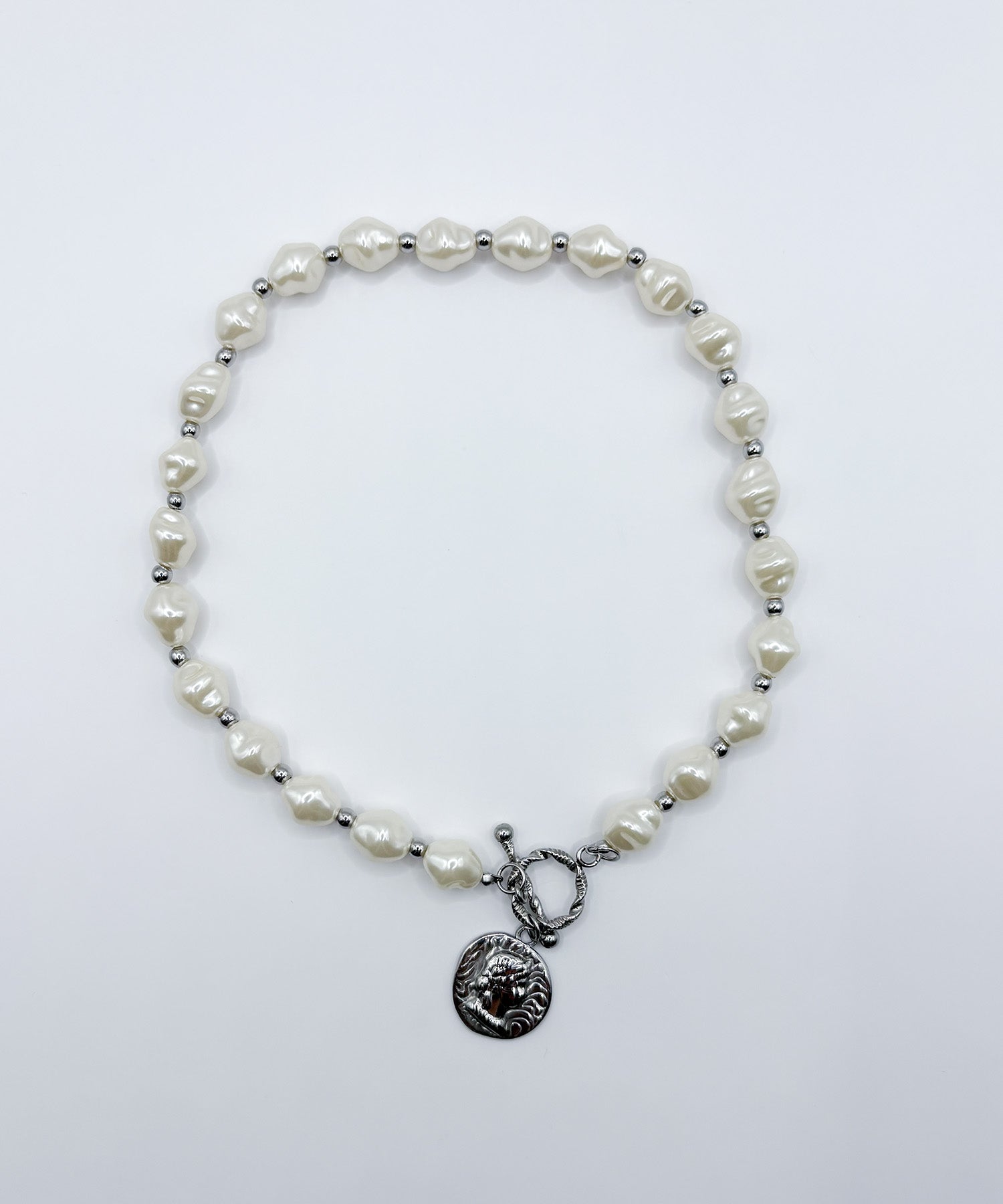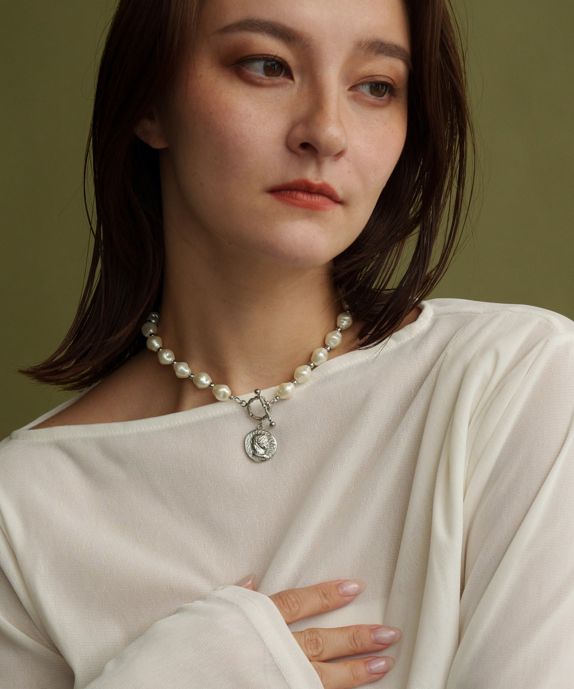 歪な形のパールパーツがアクセントとなり、おしゃれ感を演出するネックレス。コイン風のトップと間の金属パーツが輝きを添えます。着脱は、Tバーを丸カンに通すだけの簡単仕様です。