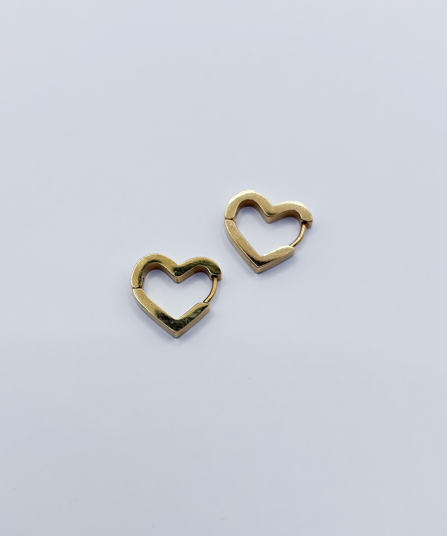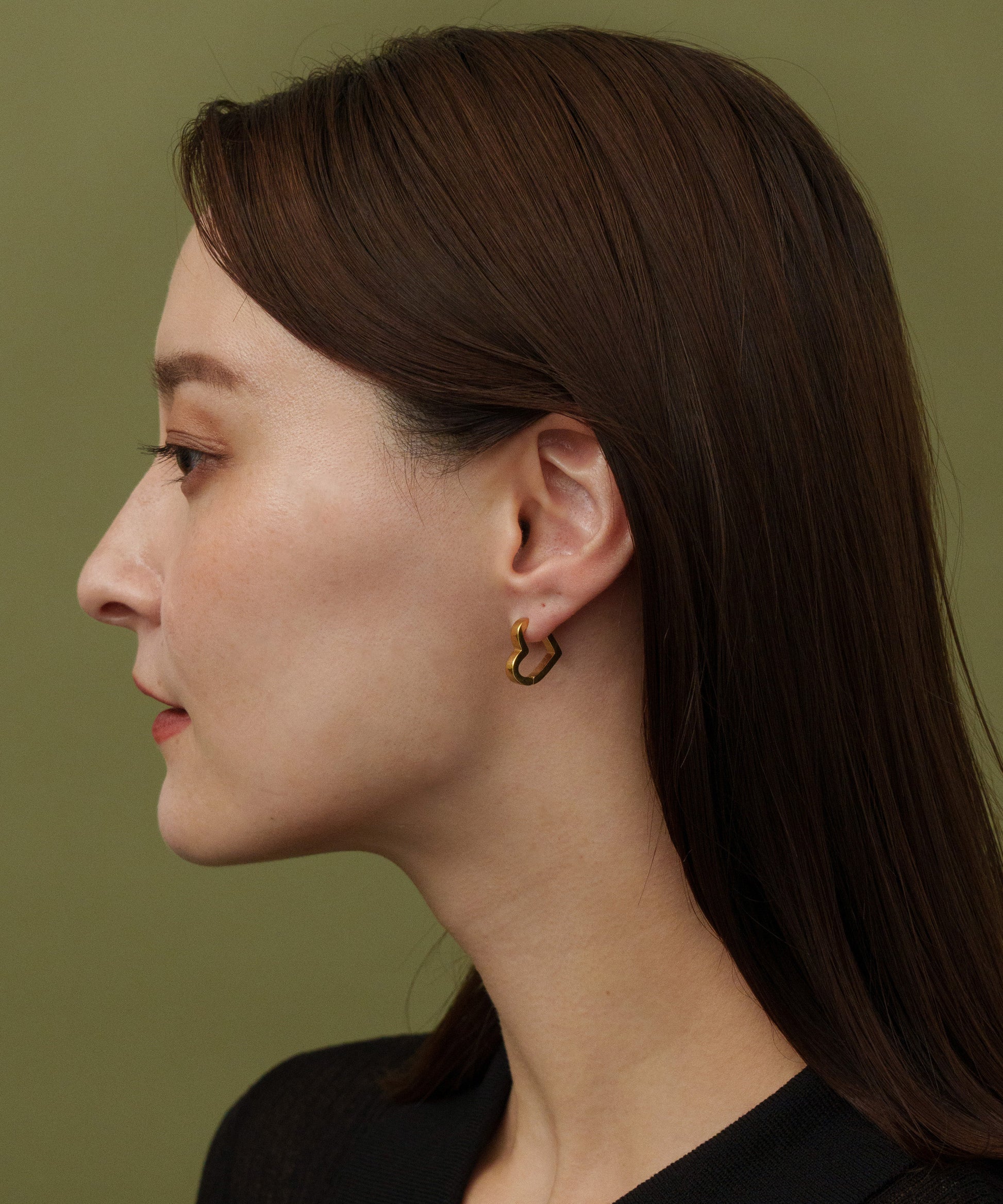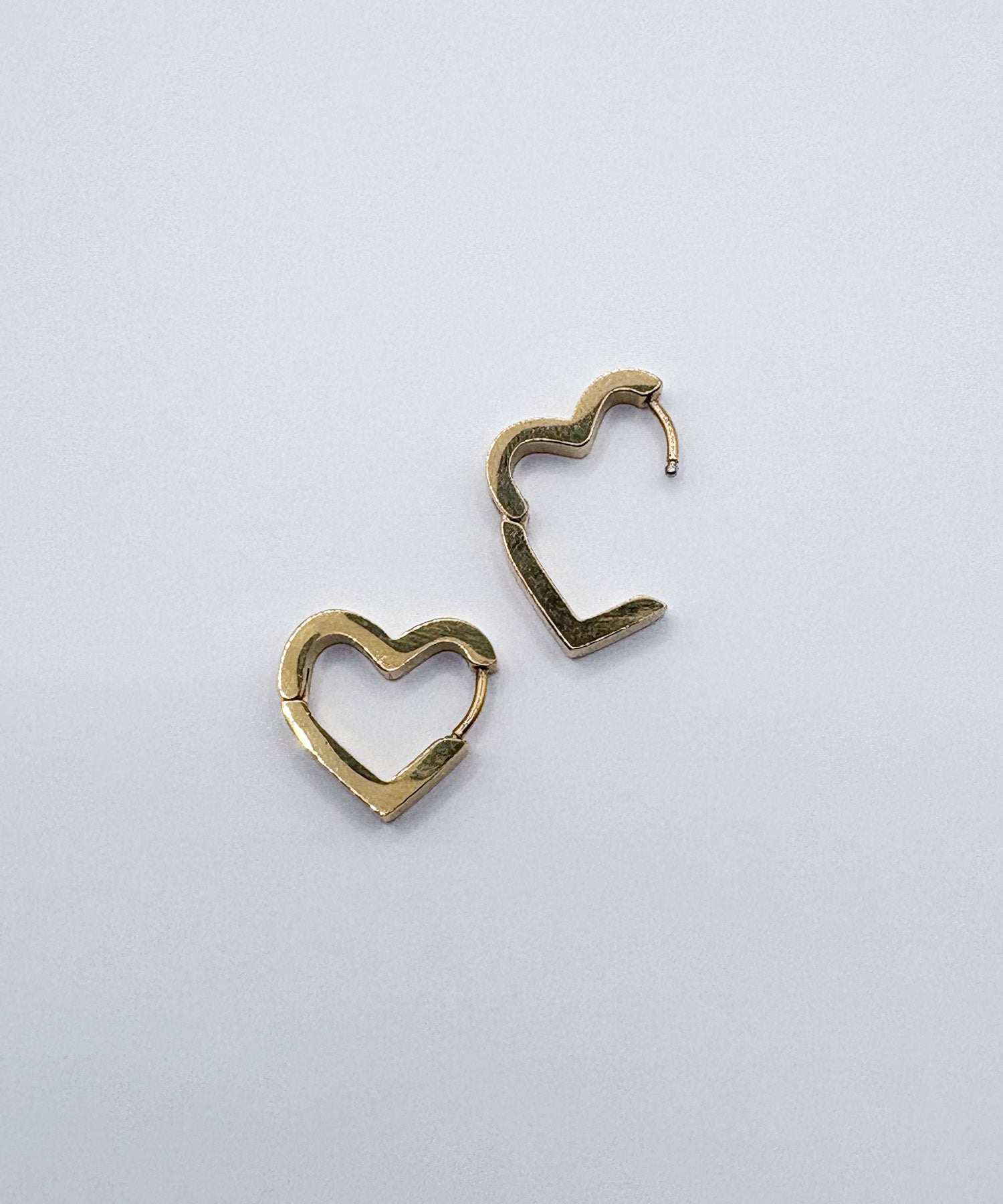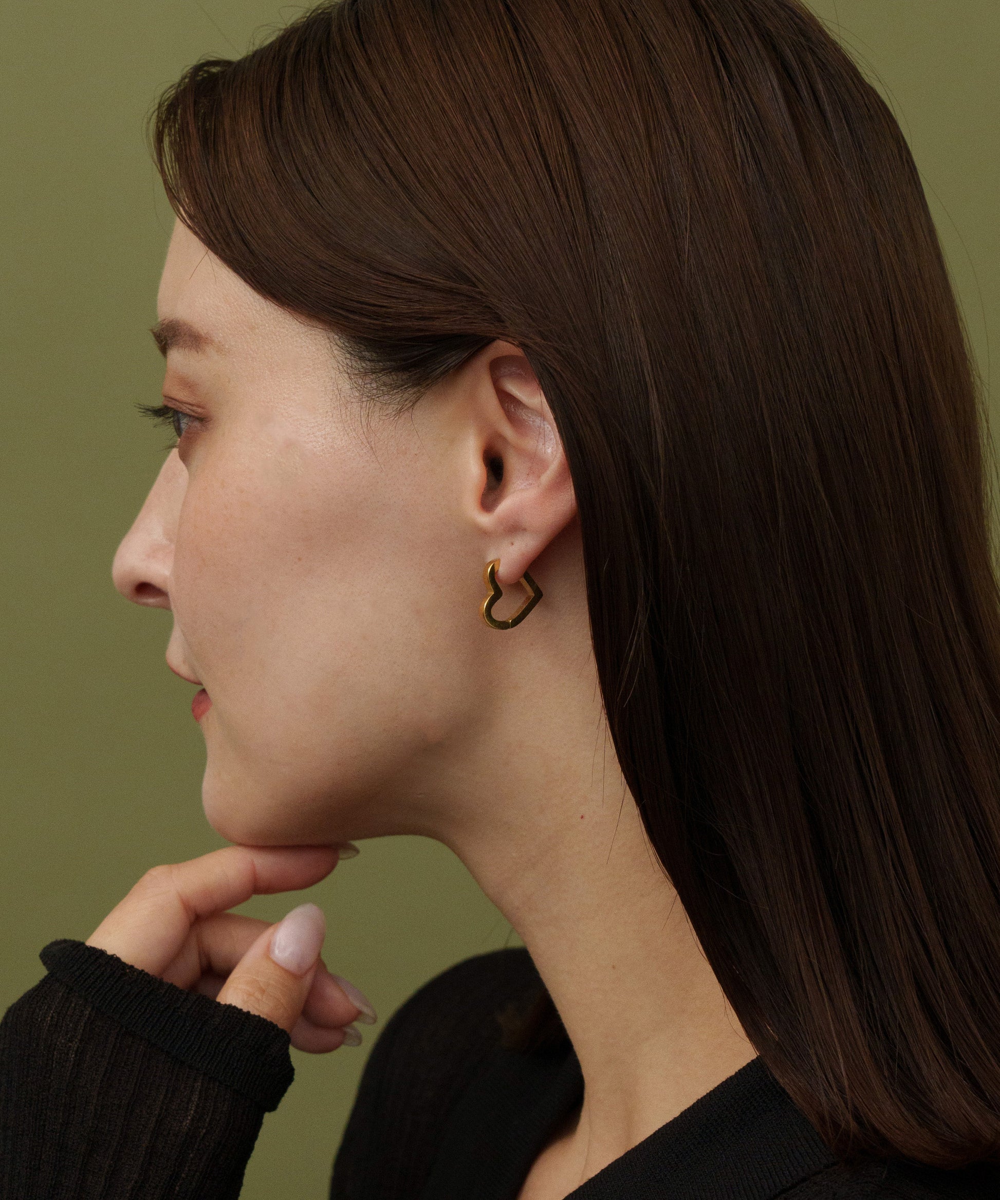 一見シンプルなプレートのように見えますが、横から見ると可愛らしいハートの形に。キャッチレスで軽量なので、付けていても負担にならないピアスです。