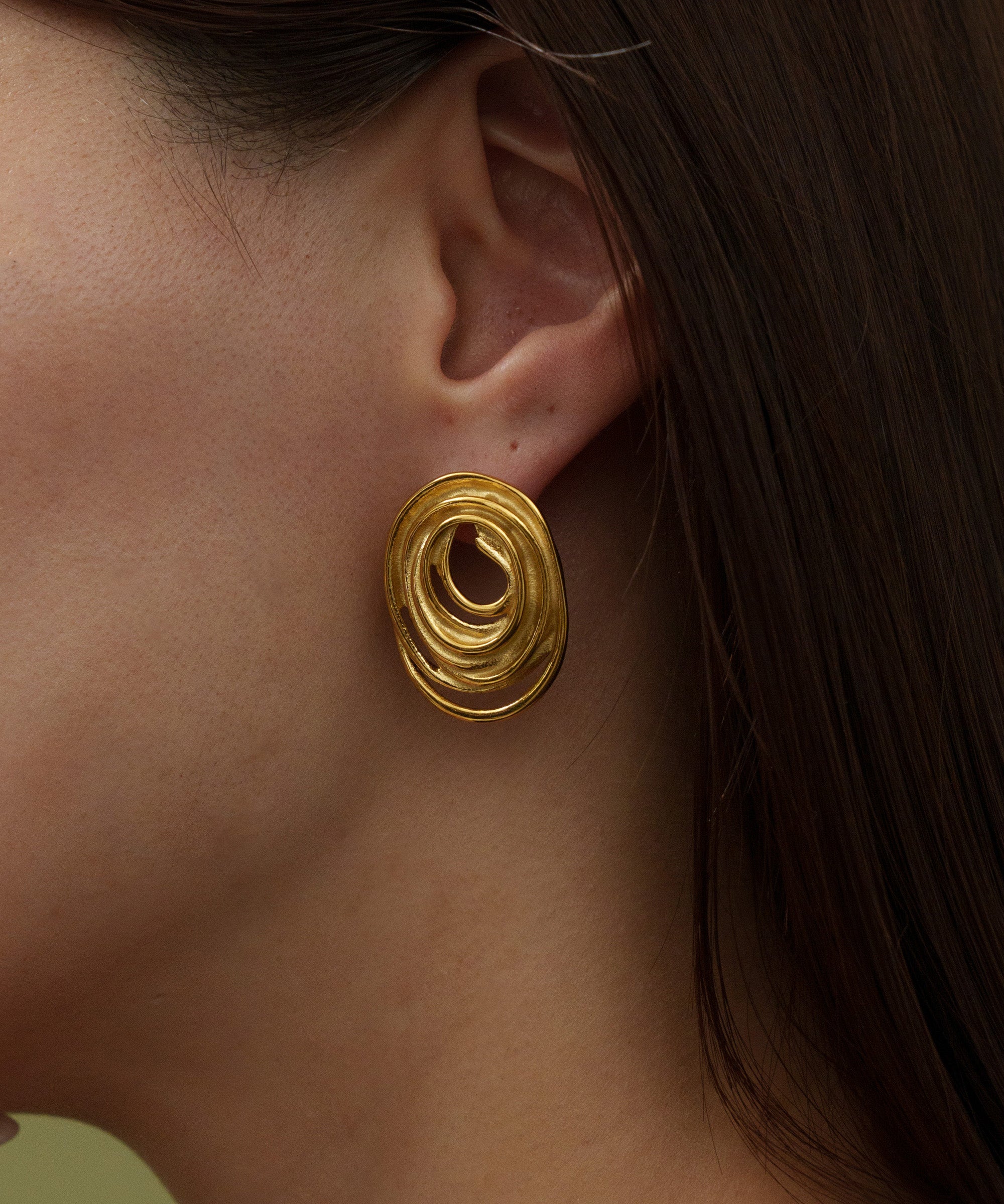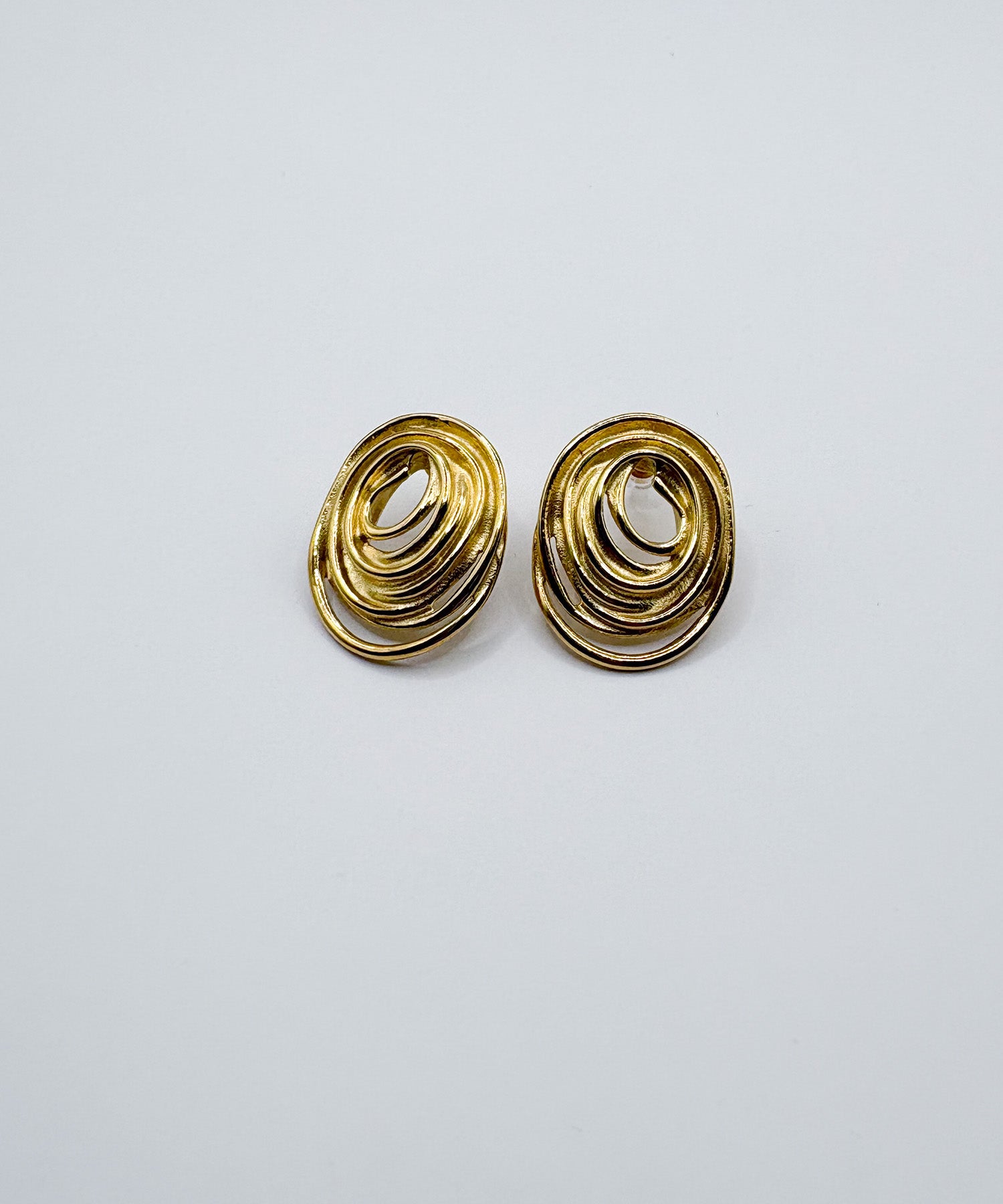 渦を巻くような芸術的なデザインのピアス。やや大ぶりで耳元を華やかに彩り、存在感抜群です。