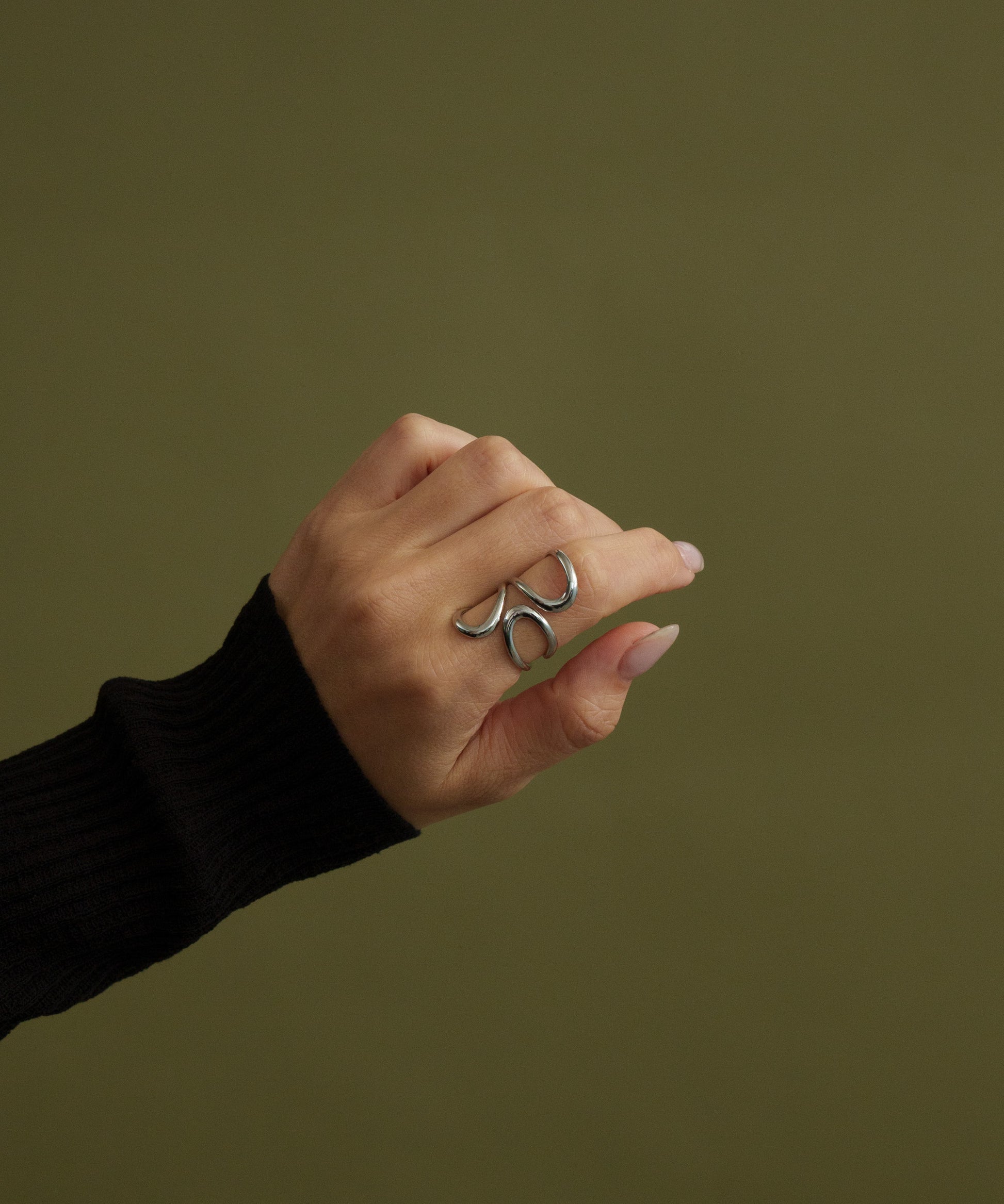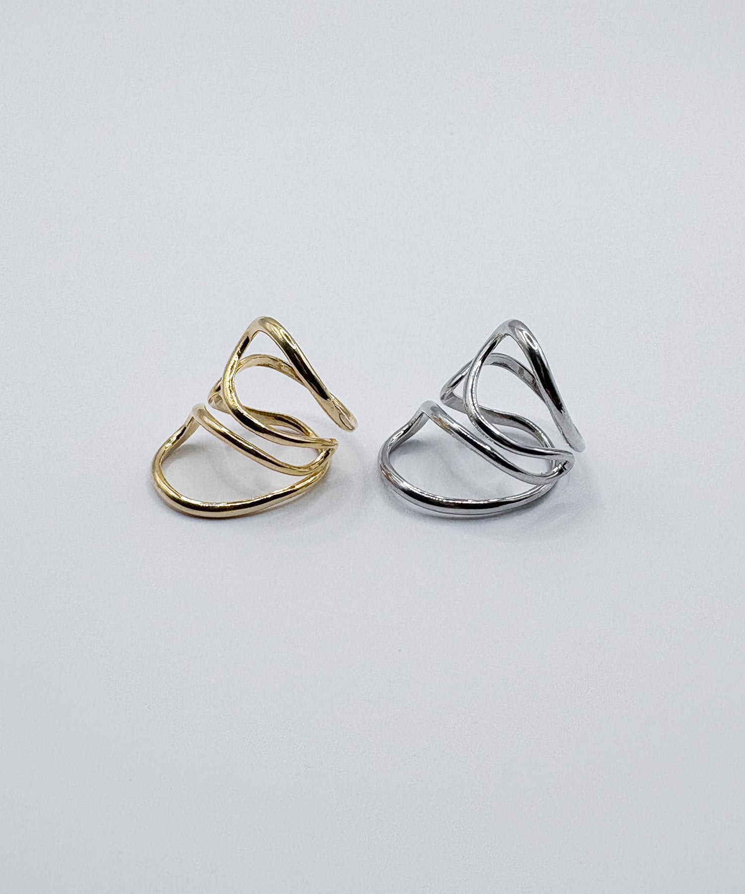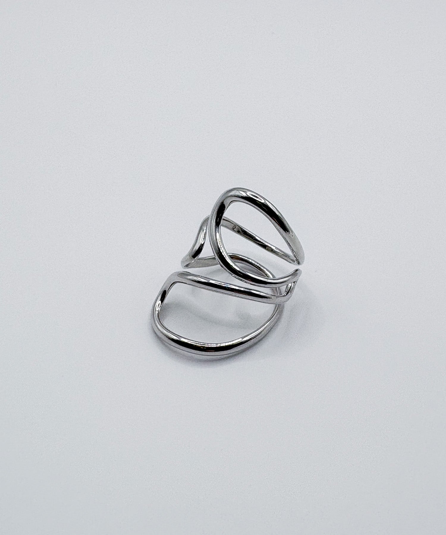 3つのカーブがやさしく指を包み込むアーティスティックなリング。関節までのやや長めの幅でトレンド感のあるモードな手元に。
