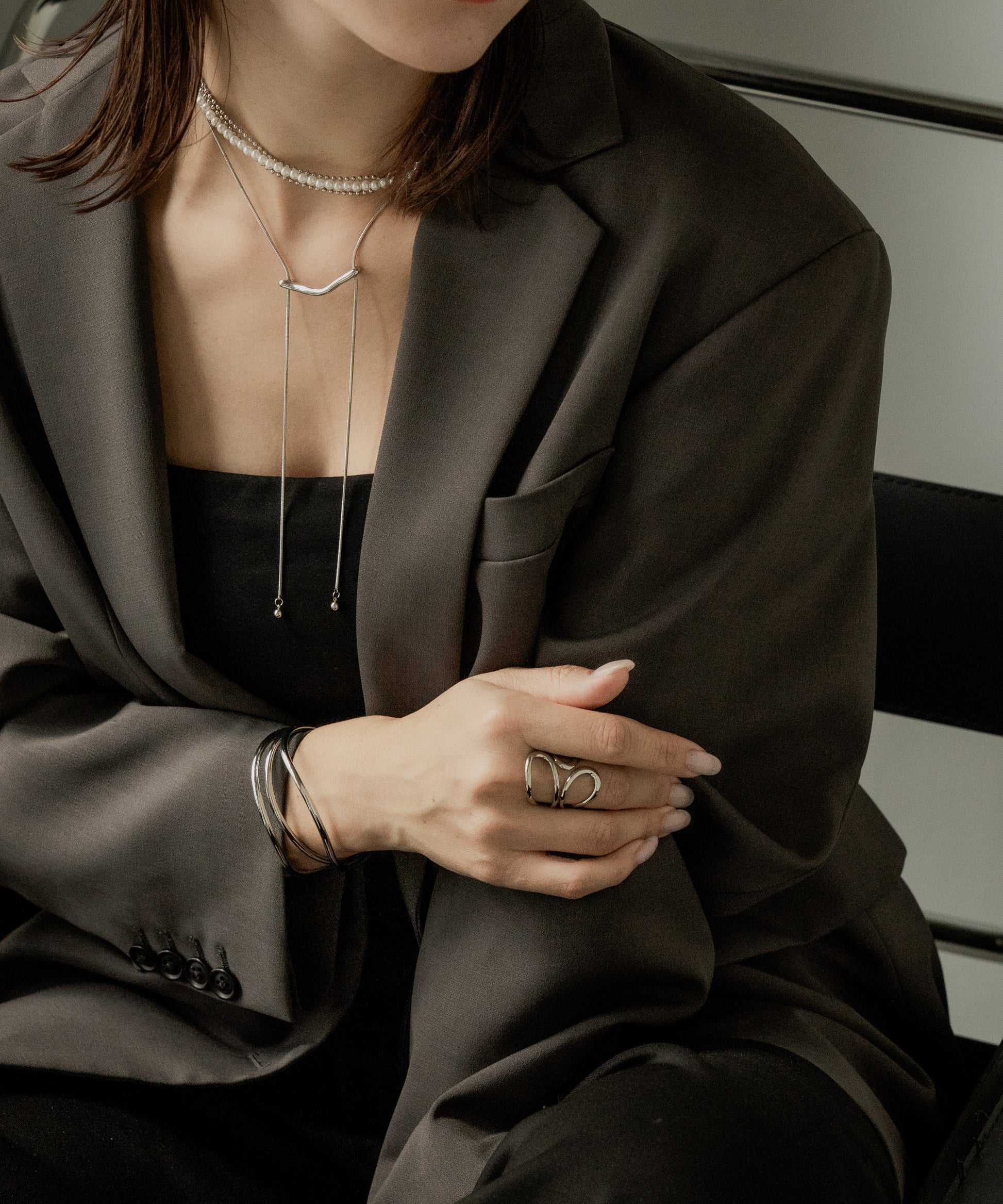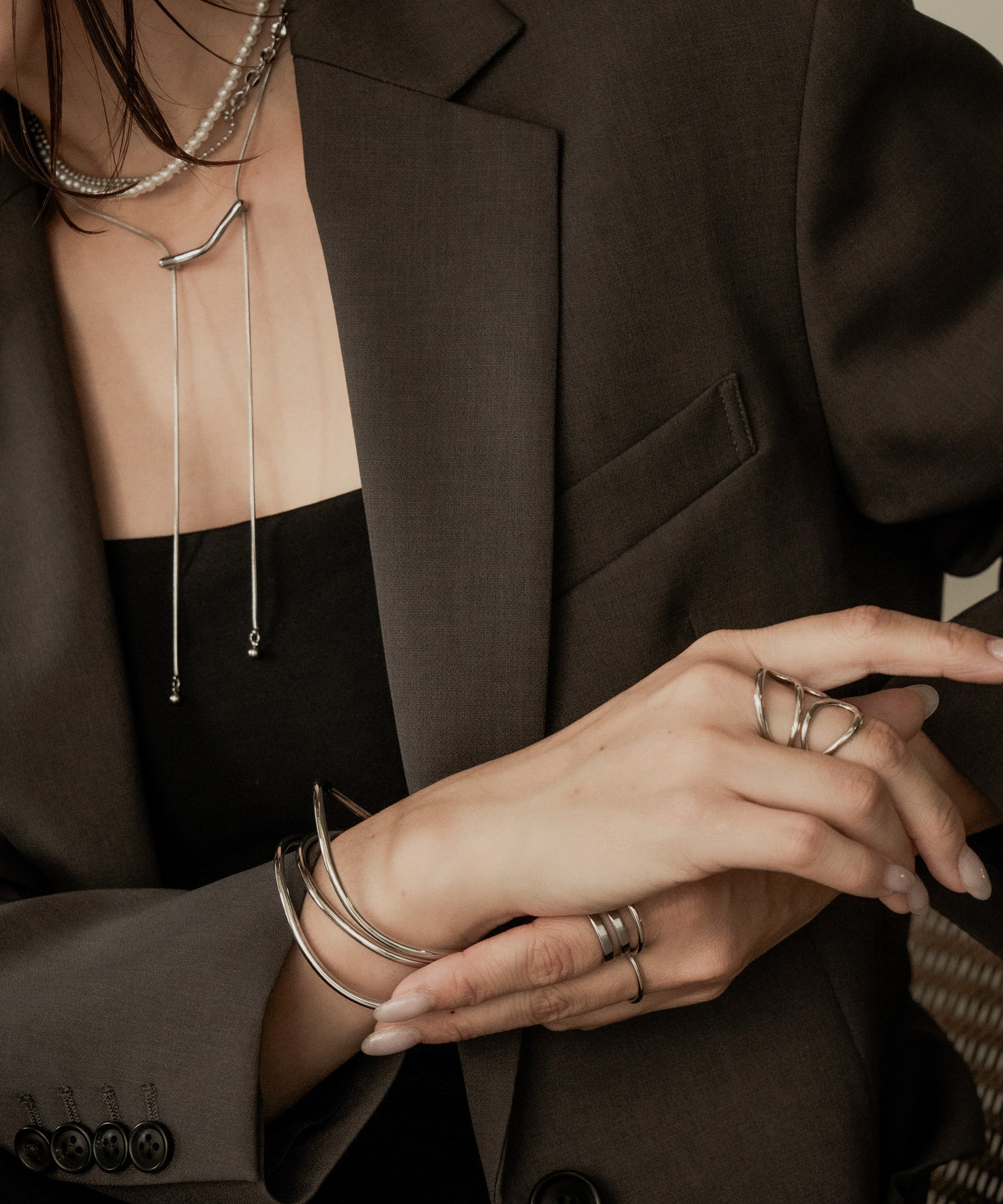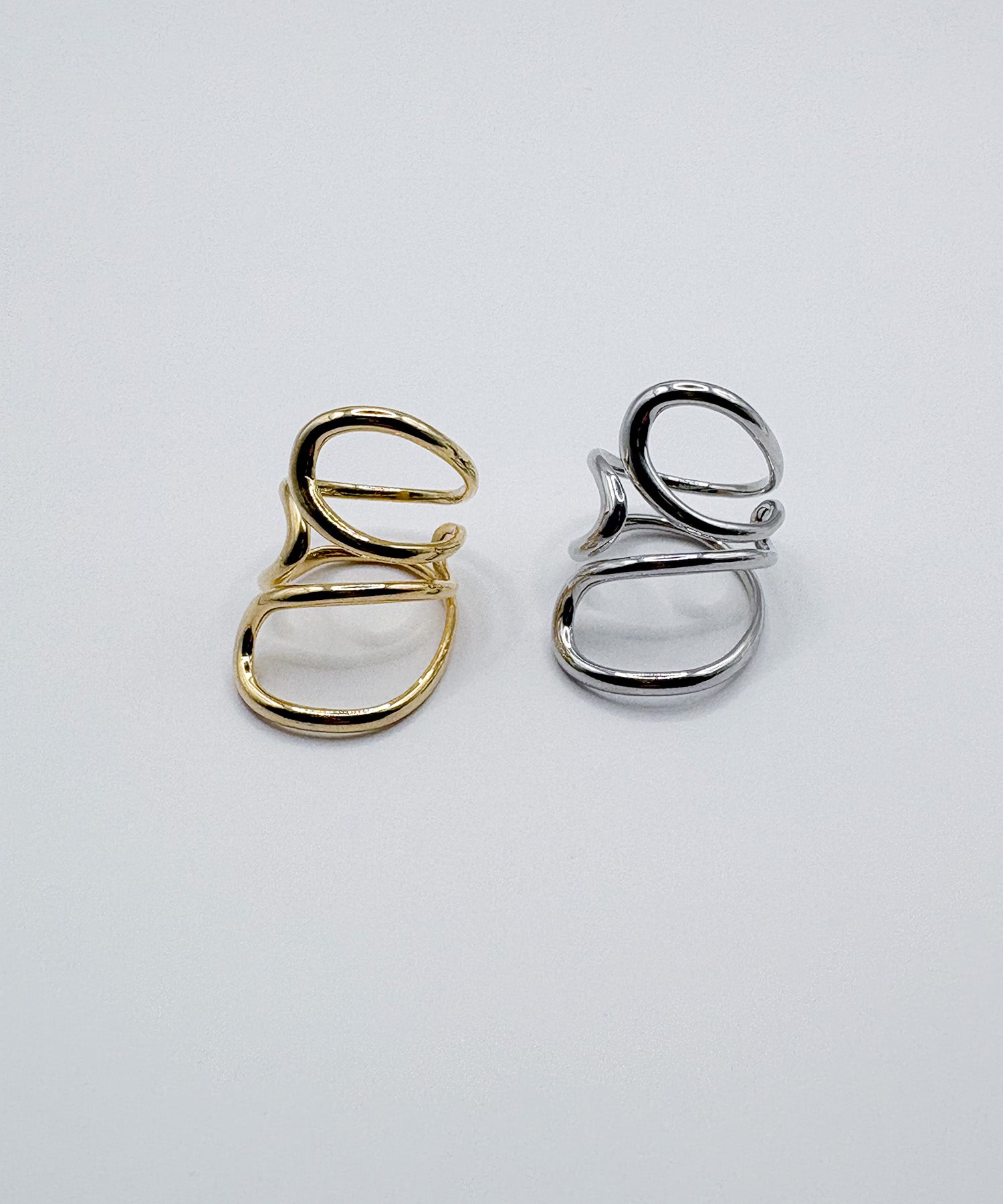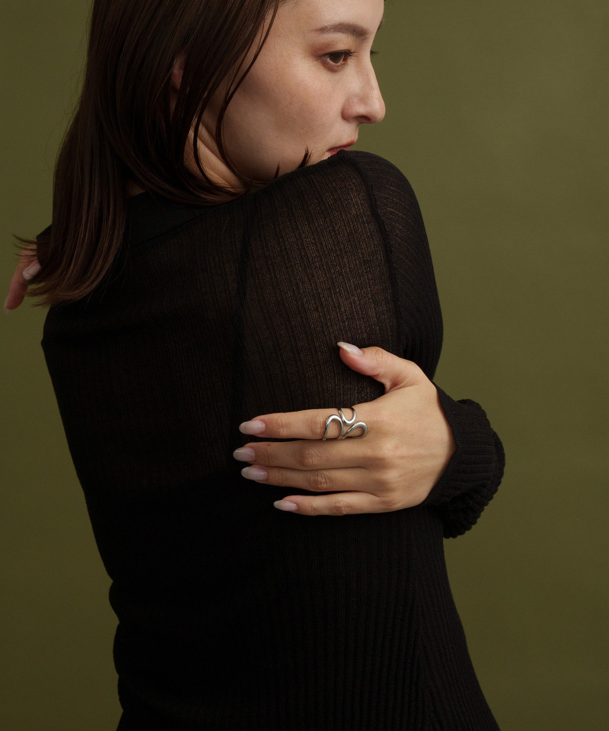 3つのカーブがやさしく指を包み込むアーティスティックなリング。関節までのやや長めの幅でトレンド感のあるモードな手元に。